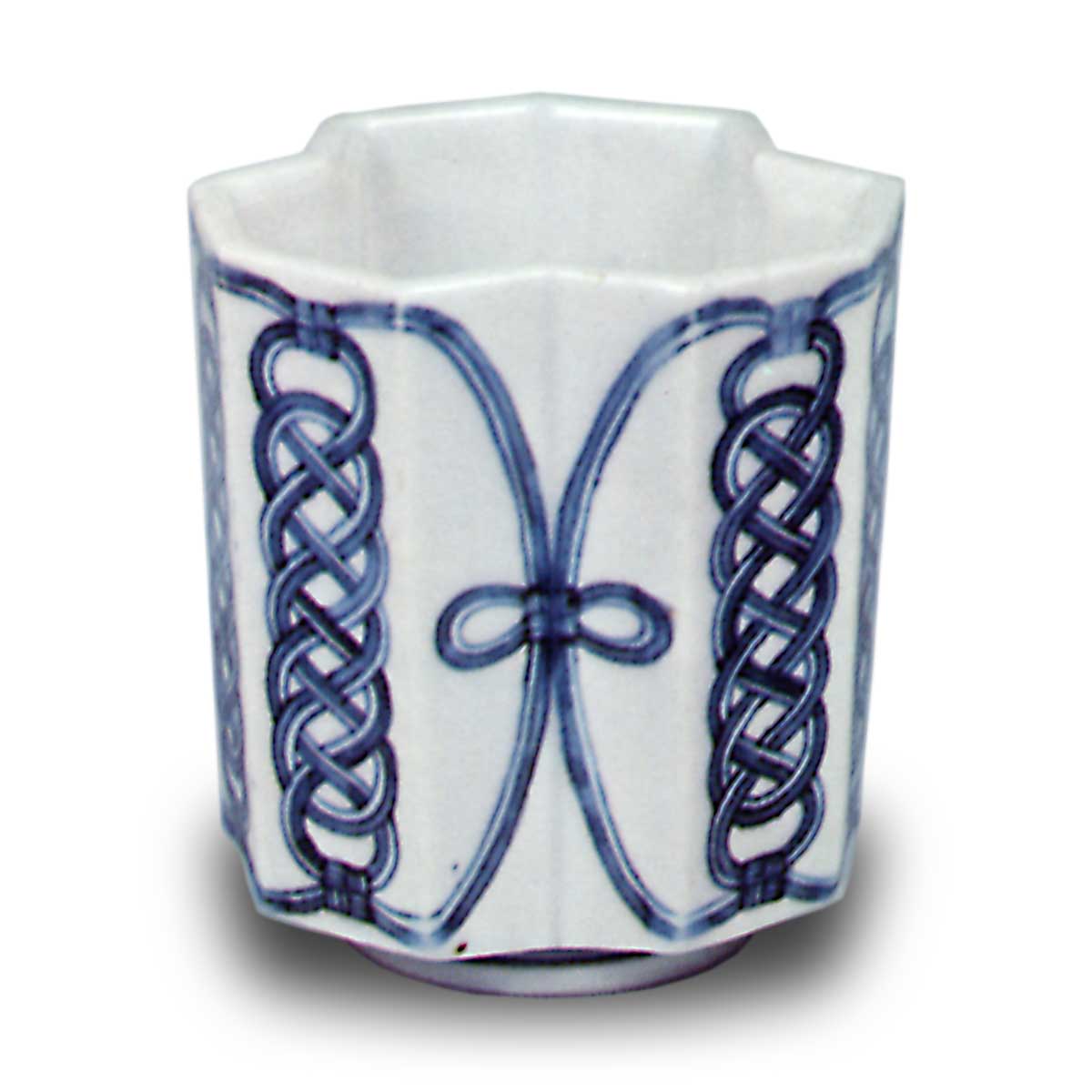 蓝釉古锅岛染付组绳纹猪口 日本蓝釉古锅岛染付组绳纹猪口 X Facebook Hatena Bookmark LINE Pinterest 复制 2025.09.28 蓝釉古锅岛染付组绳纹猪口 高6.4厘米 口径5.1×4.9厘米 底径3.4厘米这些作品虽被俗称为“松谷烧”,但如前所述,推测应属古锅岛烧范畴。虽为模具成型,整体质地厚实,作工相当扎实。虽用途应相同,但推测是作为猪口(小酒杯)制作的。其中部分器物侧面还附有细长的管状装饰。