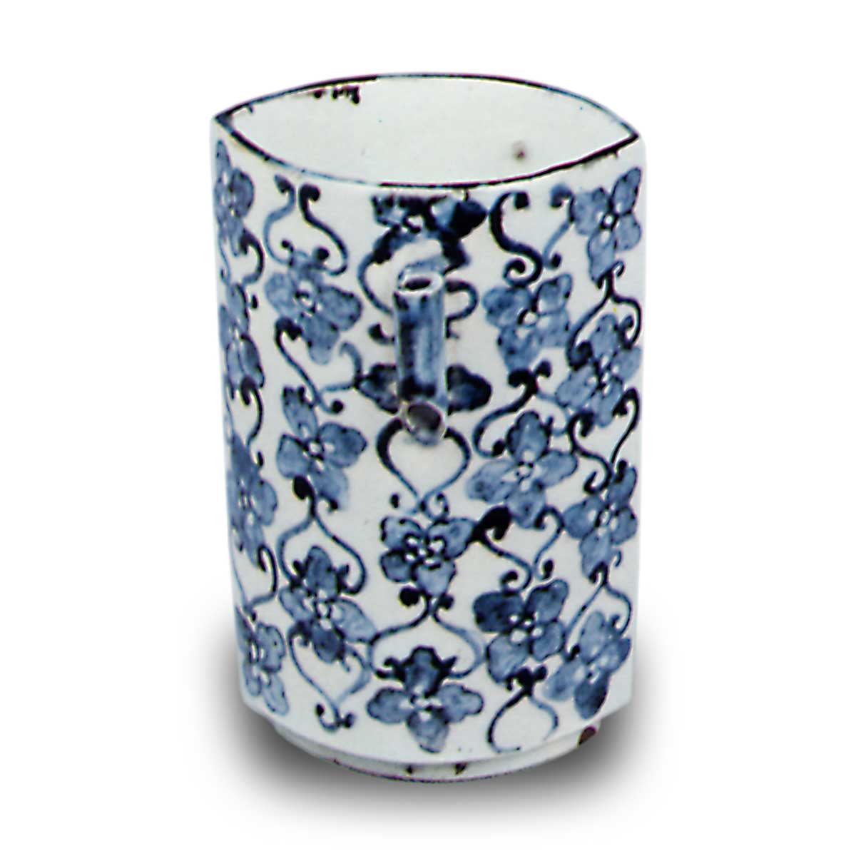 蓝釉松岛染付花衔纹猪口 日本蓝釉松岛染付花衔纹猪口 2025.09.28 蓝釉松岛染付花衔纹猪口 高9.1厘米 口径6.1×4.6厘米 底径4.8×3.4厘米这些作品虽俗称“松谷烧”,但如前所述,应归属于古锅岛烧体系。虽为模压成型,整体却厚实饱满,作工相当扎实。虽用途应相同,但推测是作为猪口(小酒杯)制作的。其中部分器物侧面还附有细长的管状装饰。
