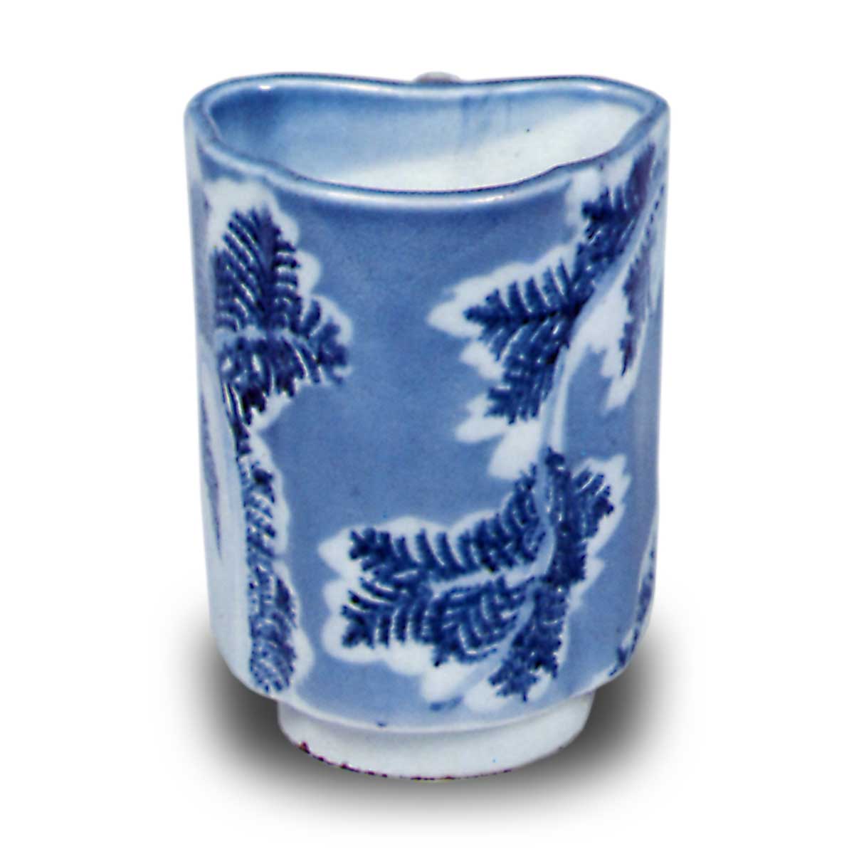 蓝釉古炬岛染付桧叶纹猪口 日本蓝釉古炬岛染付桧叶纹猪口 2025.09.28 蓝釉古炬岛染付桧叶纹猪口 高6.6厘米 口径5.0×4.2厘米 底径3.2厘米这些作品虽曾被俗称为“松谷烧”,但如前所述,推测应属古锅岛烧范畴。虽为模具成型,整体质地厚实,作工相当扎实。虽用途应相同,但推测为猪口杯。其中部分器物侧面附有细长管状装饰。