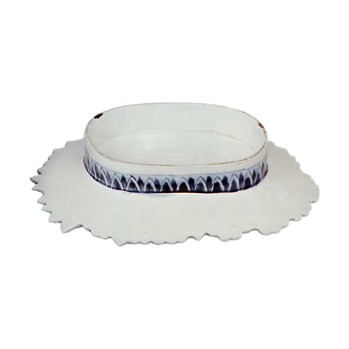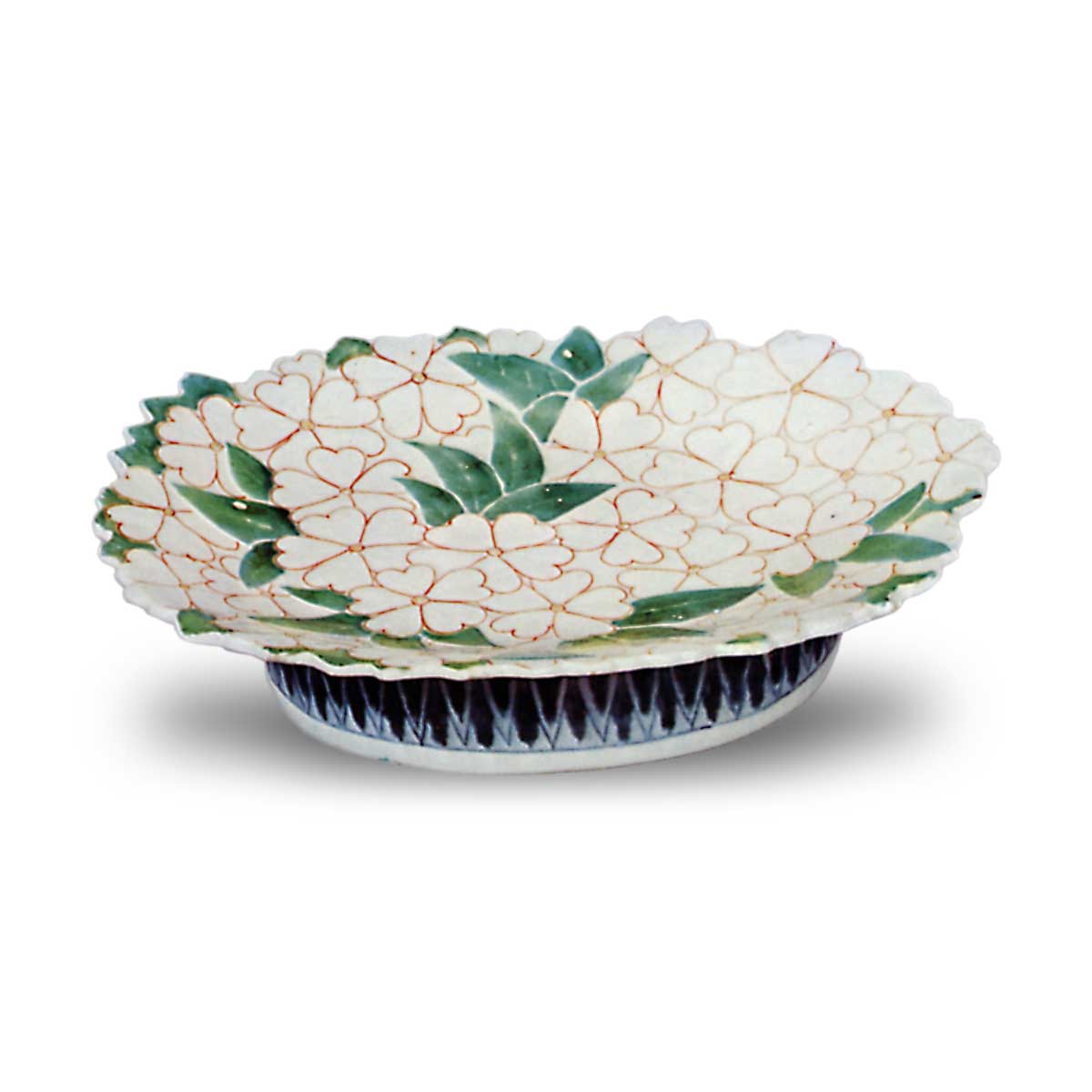 色锅岛彩绘樱花纹盘 日本色锅岛彩绘樱花纹盘 2025.09.28 色锅岛彩绘樱花纹盘 色锅岛彩绘樱花纹盘 高3.8厘米 口径16.1×7.7厘米 底座直径10.3×7.4厘米器身正面以红线描绘的樱花图案密布,边缘处随花瓣形态精细雕琢。高台相较器形显著偏高,台侧饰以青花绘制的剑尖状花瓣纹样,此纹样后世更趋形式化。此器应为五客成套之物,然现存仅此一件。想必亦属南川原古锅岛之作。