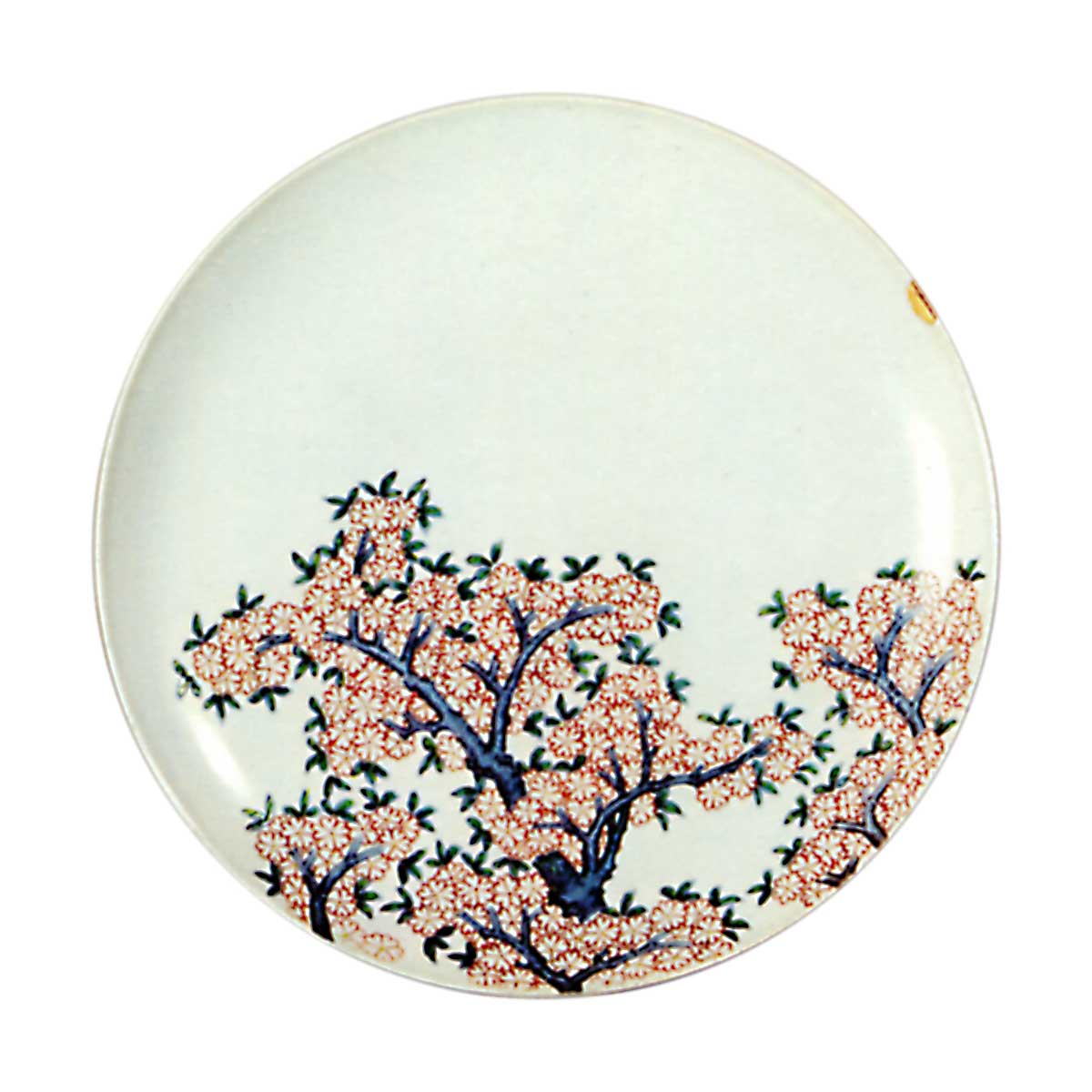 锅岛彩绘樱树纹盘 日本锅岛彩绘樱树纹盘 2025.09.28 锅岛彩绘樱树纹盘 高4.6厘米 口径19.8厘米 高台径11.1厘米此为古锅岛样式七寸盘的佳作,盘身呈平坦浅弧形。因采用生釉施釉技法,樱树树干及盘底饰以细线描绘的牡丹唐草纹、七宝衔接的底纹等青花图案,烧成后色泽浓郁。下半部的樱花树纹饰更具绘画韵味。所有花朵均以红线勾勒,花蕊处点缀黄色,虽色调淡雅却尽显雅致。此类七寸盘仅存数件,同类器物极为罕见。