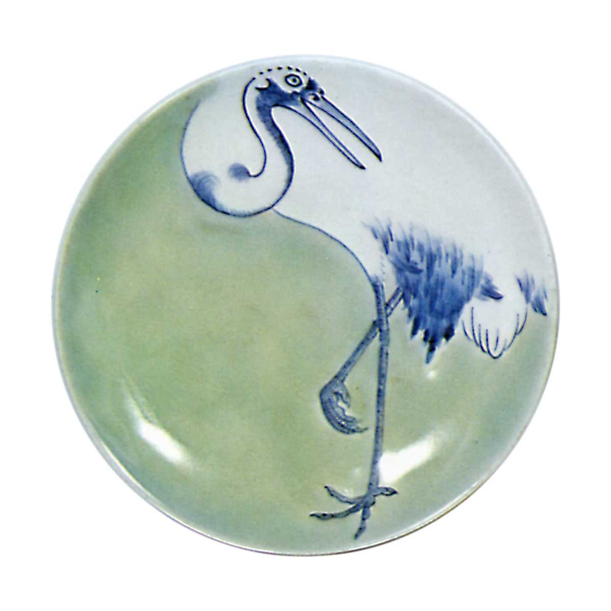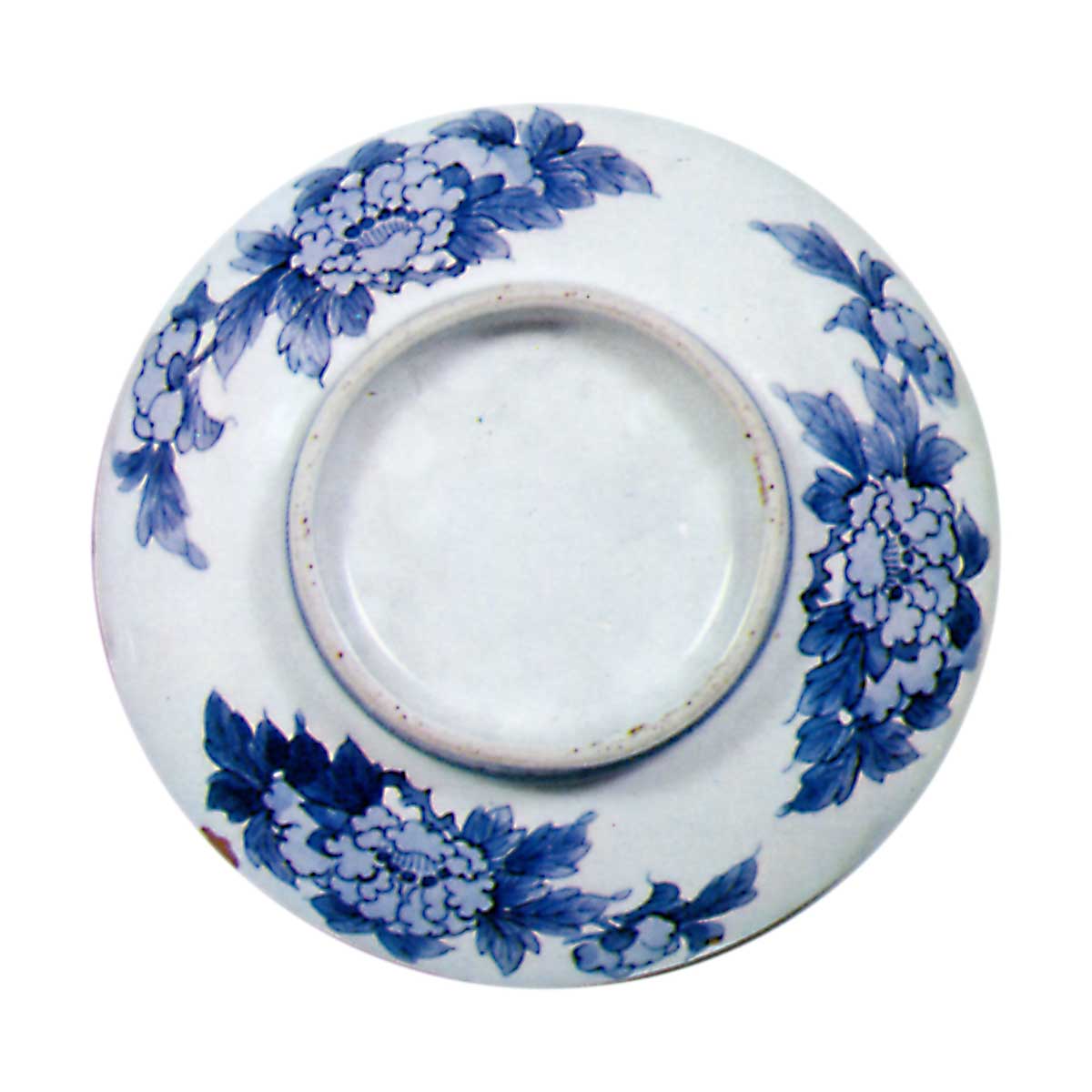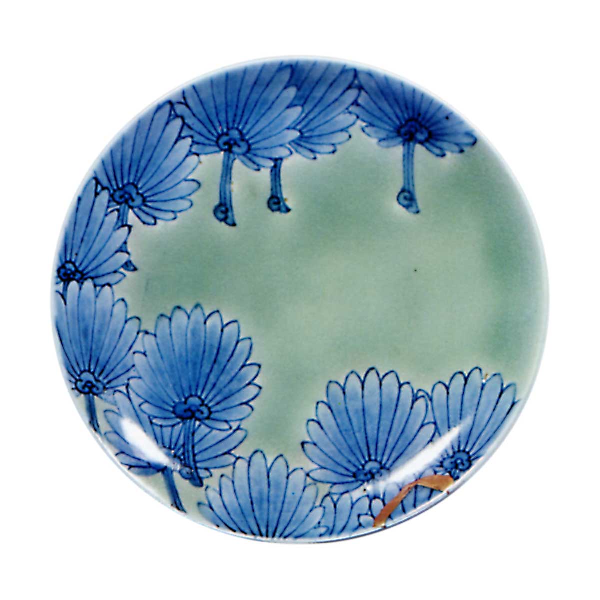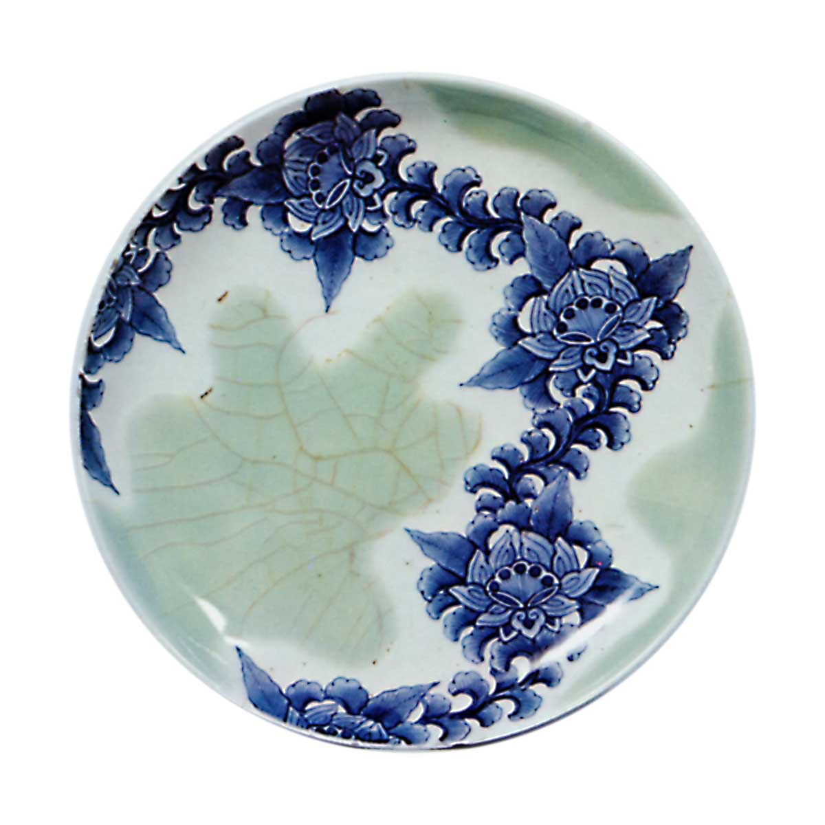 这些是古锅岛样式青瓷染付五寸盘的典型作例,同类作品数量较多。或许因均采用生釉施釉工艺,部分作品存在高台歪斜等问题。染付釉色也略显浓重,青瓷色泽烧制不均,未能呈现大川内窑特有的粉青色调。