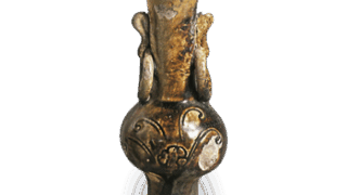 色绘枝垂樱纹盘以淡琉璃晕染地描绘枝垂樱,虽绿彩略显暗沉,但作为古锅岛器物实属罕见纹样。底纹以六角形排列的五瓣花朵唐草纹环绕,高台处则饰有古锅岛特有的双层心形连续纹样。