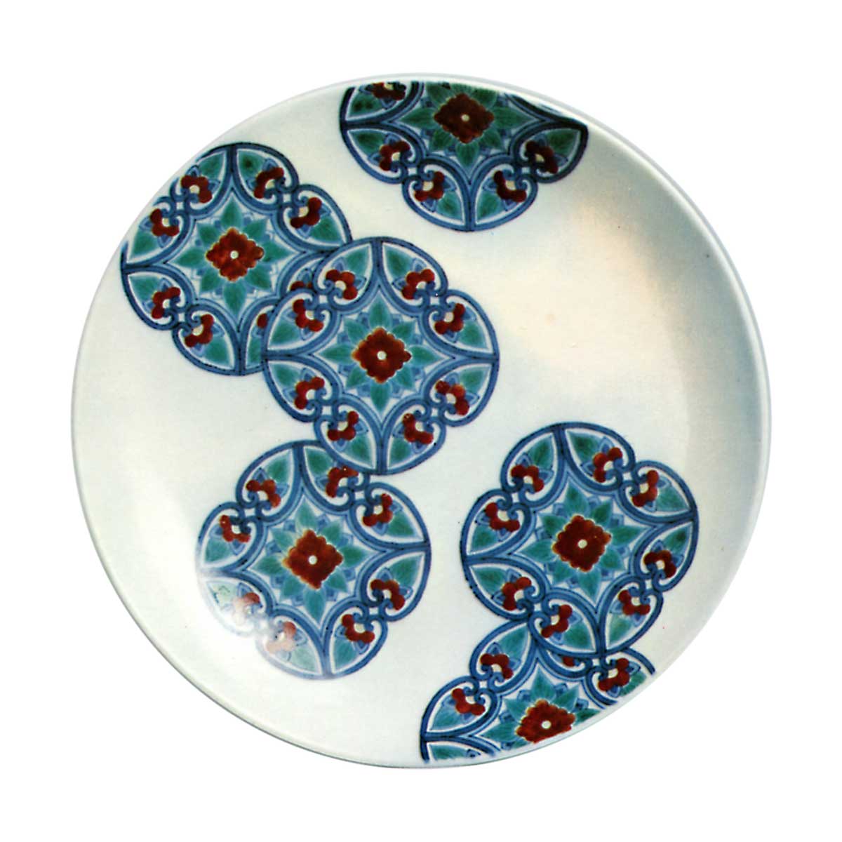 锅岛色绘花木瓜纹盘 日本锅岛色绘花木瓜纹盘 X Facebook Hatena Bookmark LINE Pinterest 复制 2025.09.28 锅岛色绘花木瓜纹盘 高4.6厘米 口径19.7厘米 底径10.0厘米此乃古锅岛样式七寸盘之精品。盘面六枚木瓜纹以艳丽色调浓彩绘就,底纹环绕古雅牡丹唐草纹,高台饰梳纹。应属南川原末期或大川内藩窑初期之作。