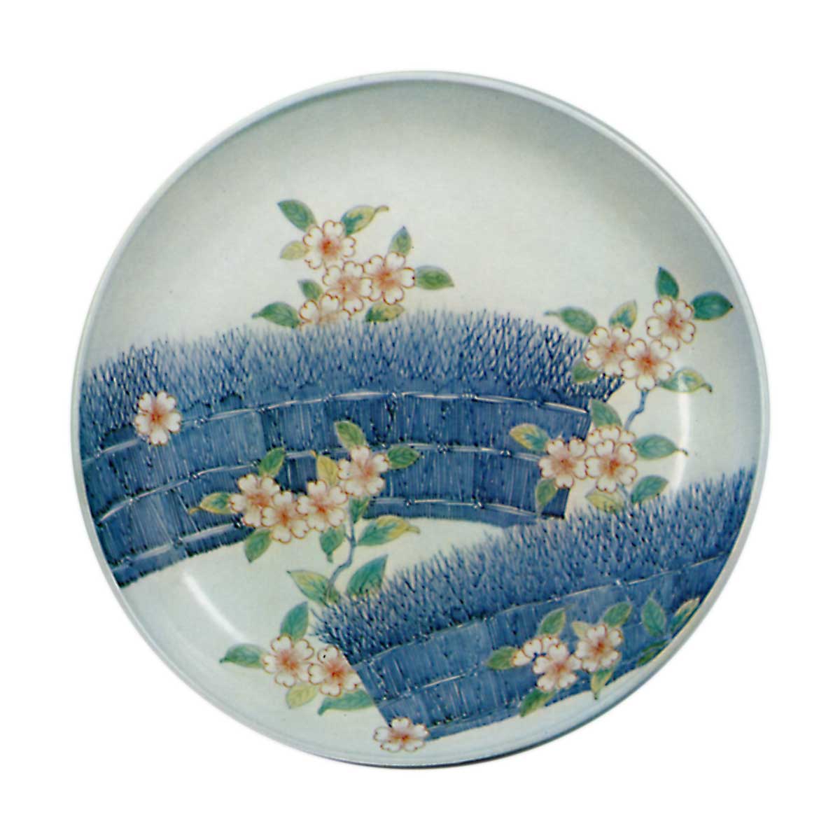 锅岛色绘柴垣纹盘 日本锅岛彩绘樱花柴垣纹盘 2025.10.04 锅岛彩绘樱花柴垣纹盘 锅岛彩绘蔦柴垣纹盘 尺盘中,存在器形边缘锐利内卷的款式。这两件作品正是此类风格的代表作,其纹饰均以粗犷的柴垣为基底,分别绘有樱花与藤蔓图案。底纹方面:樱柴垣纹盘在三面饰以牡丹唐草纹,高台处环绕着复瓣花纹;藤蔓柴垣纹盘底纹与前者相同,但高台处饰有七宝衔接纹。