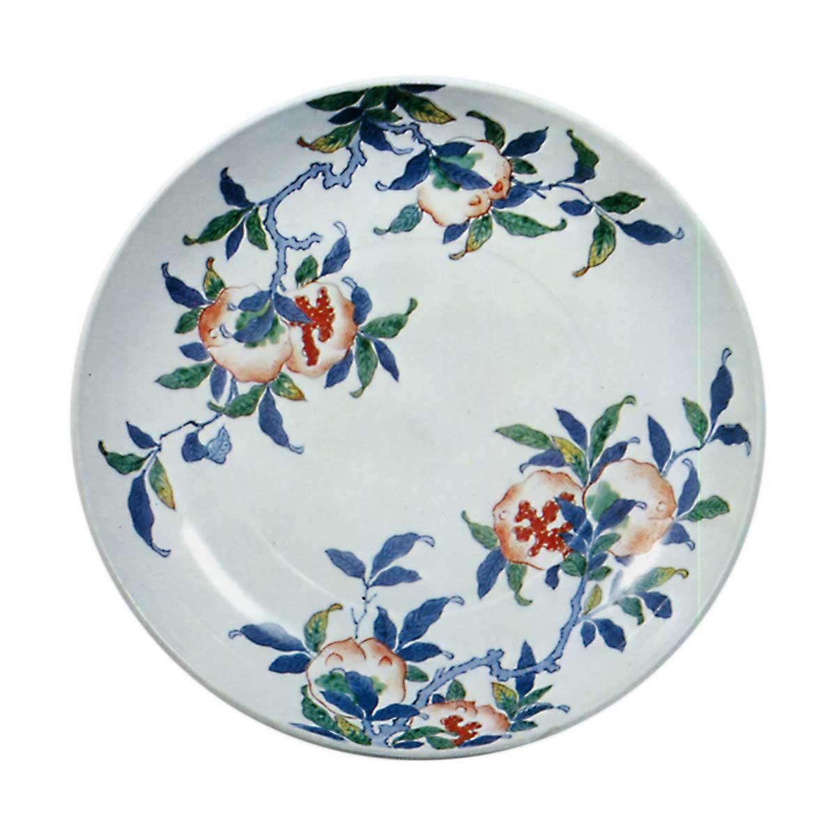 锅岛色绘石榴纹盘 日本锅岛色绘石榴纹盘 2025.10.04 锅岛色绘石榴纹盘 高8.5厘米 口径32.5厘米 底径15.4厘米作为色绘锅岛尺皿,其边缘采用阶梯状设计实属罕见。石榴图案作为吉祥纹样与桃纹并列于锅岛瓷器中频繁使用,但因笔触略显生涩,使大画面略显单薄。底面三方饰以七宝结纹,高台呈梳纹状。