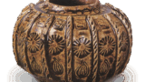 锅岛青瓷染付唐花圆纹盘 日本锅岛青瓷染付唐花圆纹盘 2025.10.04 锅岛青瓷染付唐花圆纹盘 高7.9厘米 口径30.9厘米 底座直径14.1厘米与前图相同,以青瓷与青海波纹为基调,盘内散落着七枚内饰唐花纹的圆形纹饰。如同前图所示,散纹图案间的留白处理极为精妙。底纹饰三面饰以七宝结纹,底座饰以梳纹纹样。
