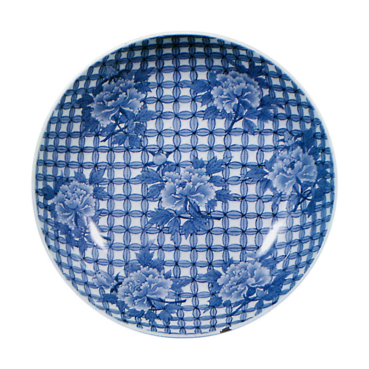 锅岛青花七宝地牡丹纹盘 日本锅岛青花七宝地牡丹纹盘 2025.10.04 锅岛青花七宝地牡丹纹盘 高9.9厘米 口径33.6厘米 底座直径16.6厘米此件染付尺皿较常规尺寸更为宽大,七宝地纹中描绘折枝牡丹,花瓣晕染效果尤为精美。底纹三面饰有牡丹枝叶,叶尖呈唐草纹样延伸。底座环绕七宝衔接纹。