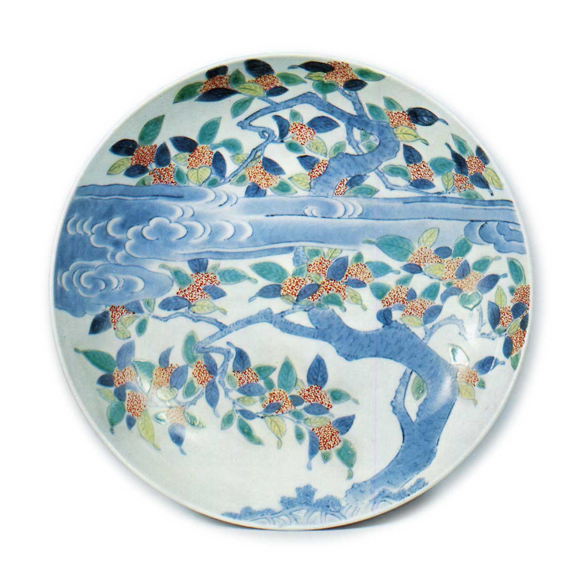 锅岛彩绘木犀纹盘 日本锅岛彩绘木犀纹盘 2025.10.04 锅岛彩绘木犀纹盘 高5.9厘米 口径26.1厘米 底径10.8厘米此为七寸盘的代表作之一,盘面以粗犷笔触描绘木犀树,树间点缀云朵,构图别具一格。青花色调略显淡雅,盘底饰有七宝结纹,并采用梳纹高台。胎体立面圆润饱满,质地精良。