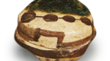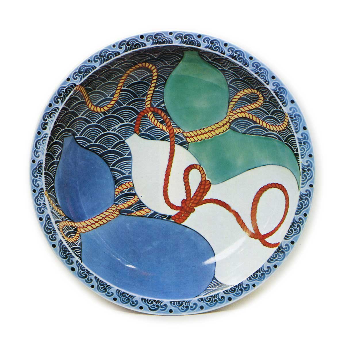 锅岛色绘三瓢纹盘 日本锅岛色绘三瓢纹盘 2025.10.04 锅岛色绘三瓢纹盘 口径20.5厘米此为七寸盘的代表作,盘缘呈铙钵状。盘面饰有三瓢纹样,在众多锅岛瓷器中堪称最具魅力之作。底纹绘青海波纹,盘缘环绕波涛纹饰。青花虽略显暗沉,但色调鲜明,正是此盘价值所在。