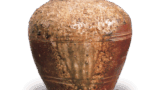 边缘和腰部的浅色釉面以及底部的釉面,在白色背景上完美地映衬出优雅柔和的越前烧色彩。