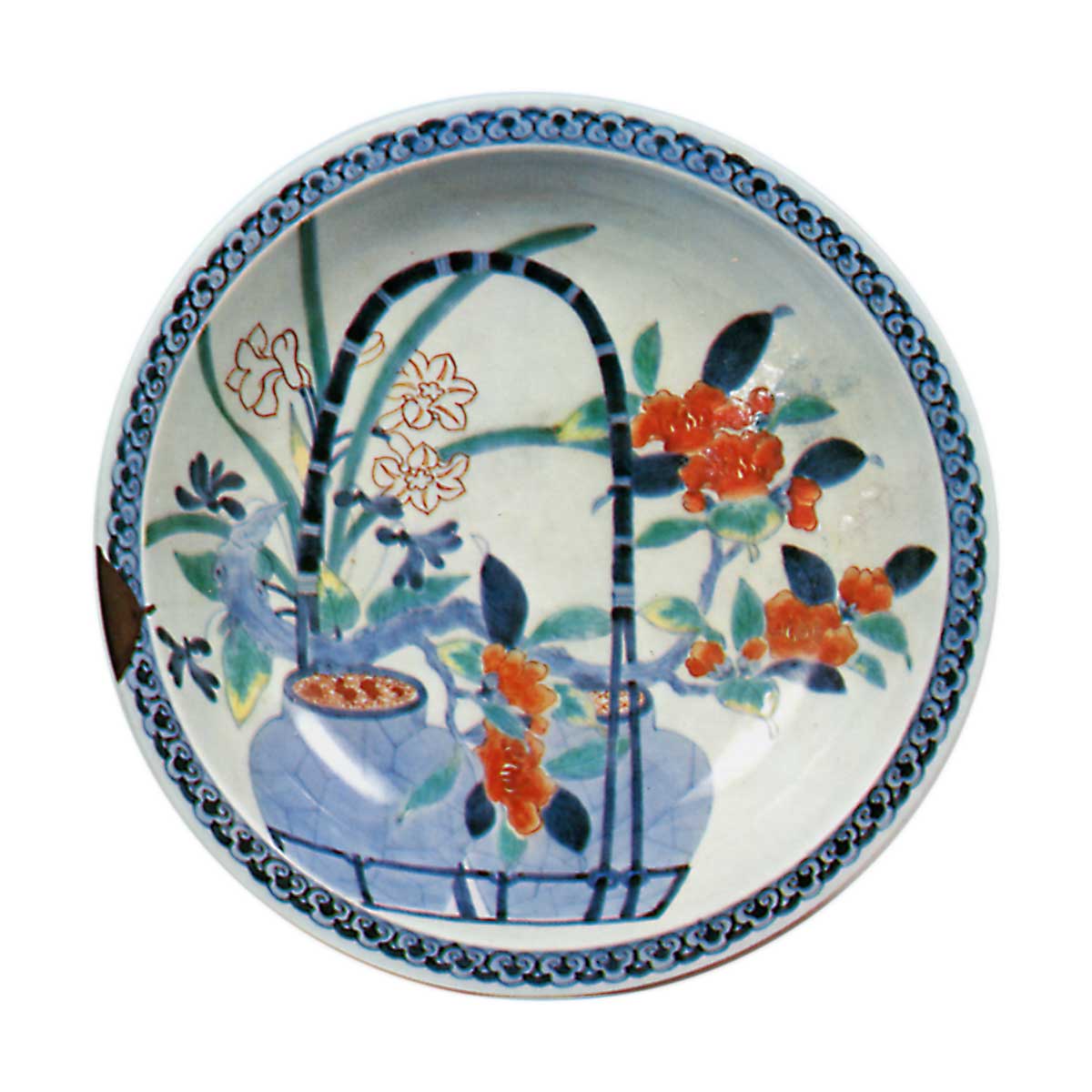 锅岛色绘椿壶纹盘 日本锅岛色绘椿壶纹盘 2025.10.04 锅岛色绘椿壶纹盘 高5.6厘米 口径20.2厘米 底径10.3厘米 东京国立博物馆长柄托架上置两只壶,其间点缀山茶与水仙。此纹样仅见于鐔缘盘,实属独特纹饰。盘缘饰灵芝衔接纹,底面以七宝结纹为基底环绕梳纹。