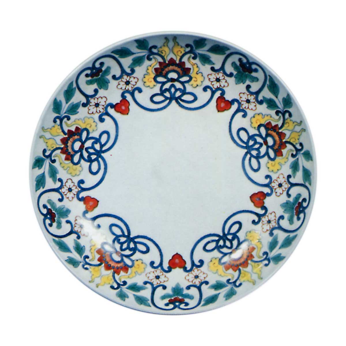 锅岛色绘唐草纹盘 日本锅岛色绘唐草纹盘 X Facebook Hatena Bookmark LINE Pinterest 复制 2025.10.04 锅岛色绘唐草纹盘 高5.8厘米 口径20.1厘米 底径10.8厘米 冈山美术馆与前图同为典型的纹样设计作品,青花与色绘均达到理想烧制效果。背面三面饰以花唐草纹,底足为梳纹底。