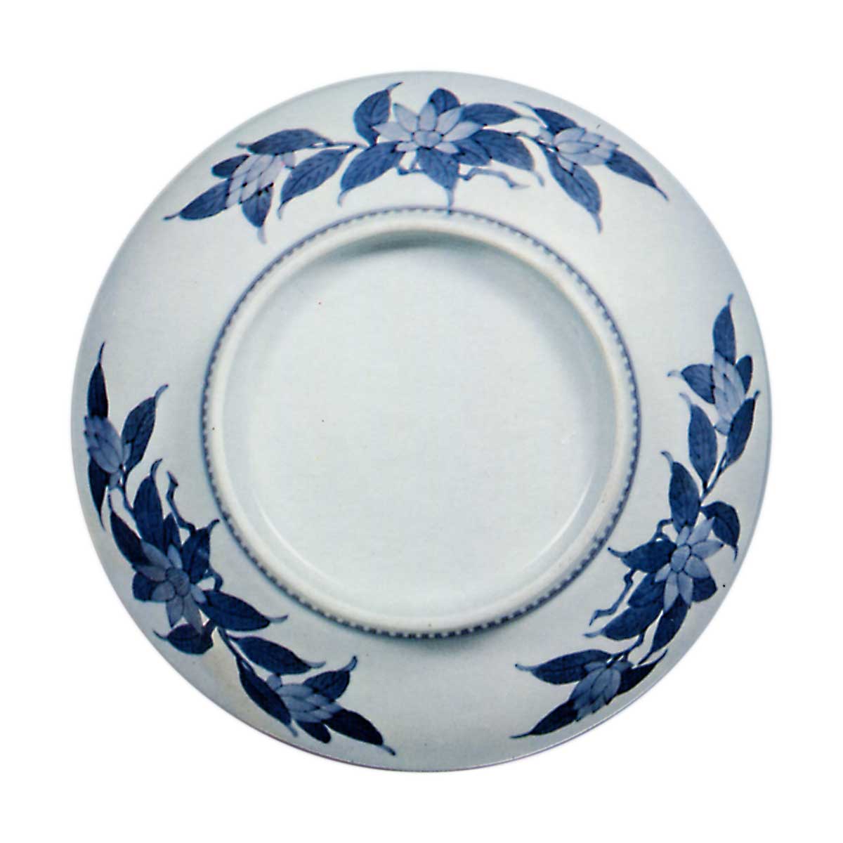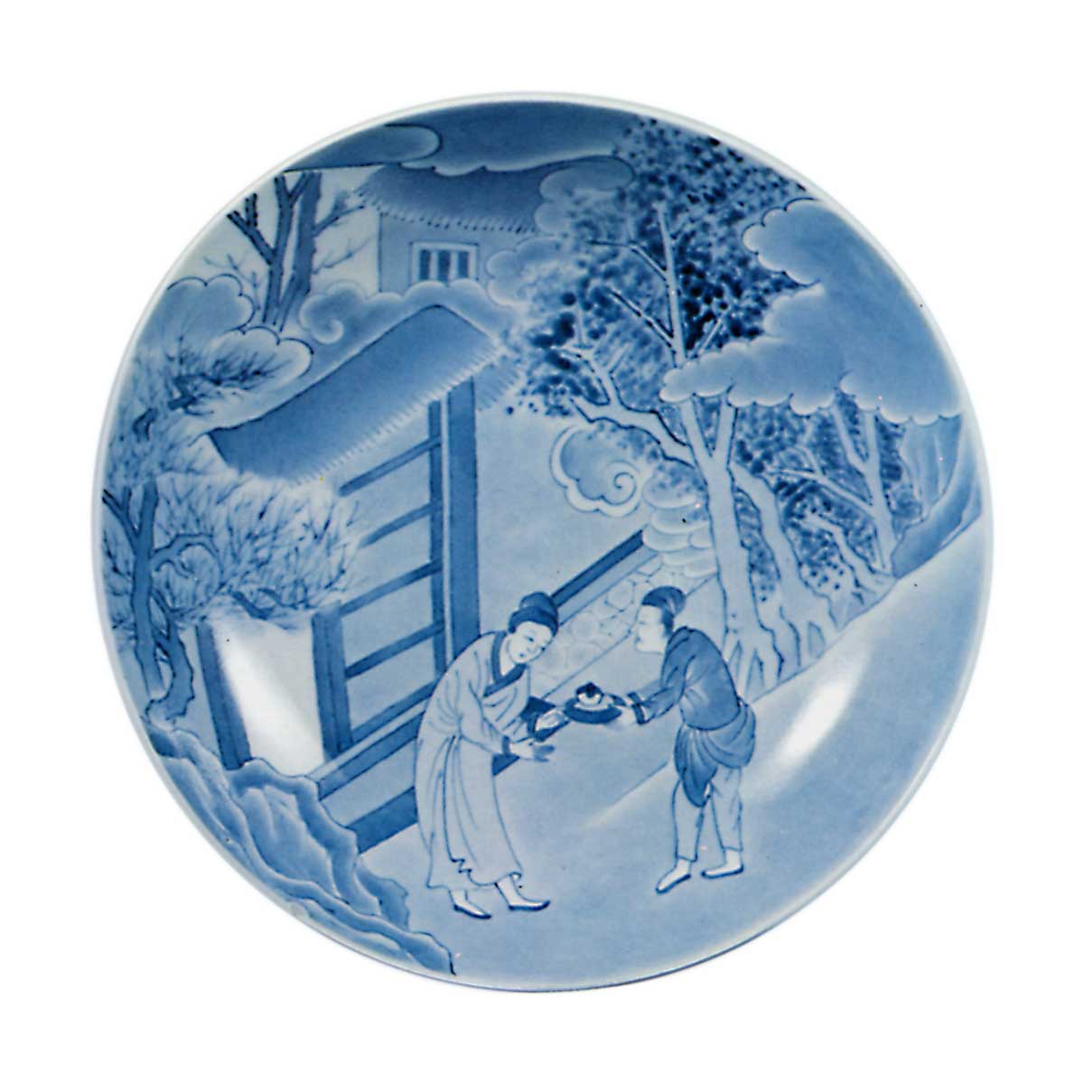 锅岛染付唐人物文碟 日本锅岛染付唐人物文碟 2025.10.04 锅岛染付唐人物文碟 锅岛染付唐人物文碟 高5.5厘米 口径19.7厘米 底径10.6厘米 东京国立博物馆此作应取材于中国故事。画面满布以房屋为背景的唐代人物图,薄瑠璃釉的渲染笔触均匀无瑕,彰显染付技艺之精湛。右图为器物背面,第167图亦采用相同背面绘制技法。此外,彩绘器物中亦有呈现相同背面纹样的作品,此类器物制作工艺皆属上乘。据推测应为元禄年间或更早时期之作。