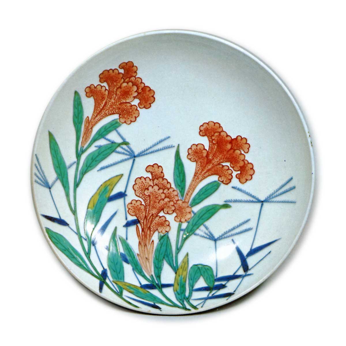 锅岛色绘鸡头纹盘 日本锅岛色绘鸡头纹盘 2025.10.06 锅岛色绘鸡头纹盘 高4.4厘米 口径14.7厘米 底径7.9厘米 冈山美术馆盘面以鲜明明快的色调描绘鸡头花与野草交织的纹样。作为五寸盘堪称最杰出的作品,胎土质地亦属上乘。盘底三面饰有花唐草纹,配以梳纹高台。