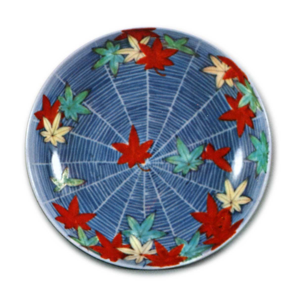 锅岛色绘蜘蛛网红叶纹盘 日本锅岛色绘蜘蛛网红叶纹盘 2025.10.06 锅岛色绘蜘蛛网红叶纹盘 口径14.8厘米盘面以墨色勾勒白底蜘蛛网纹样,其上点缀彩绘红叶。此纹样设计别具匠心,同款图案亦用于八角小碟之上。