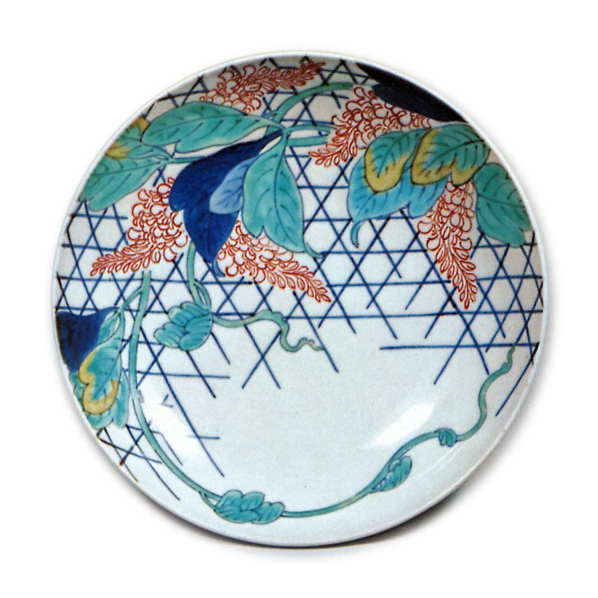 锅岛色绘葛文盘 日本锅岛色绘葛文盘 2025.10.06 锅岛色绘葛文盘 高4.4厘米 口径14.7厘米 高台径8.0厘米 冈山美术馆此作将缠绕竹篱的葛藤华丽地转化为纹样,巧妙运用留白技法。盘底三面饰牡丹唐草纹,底足环绕梳纹,青花釉色浓郁饱满。