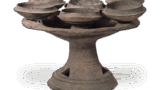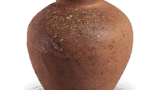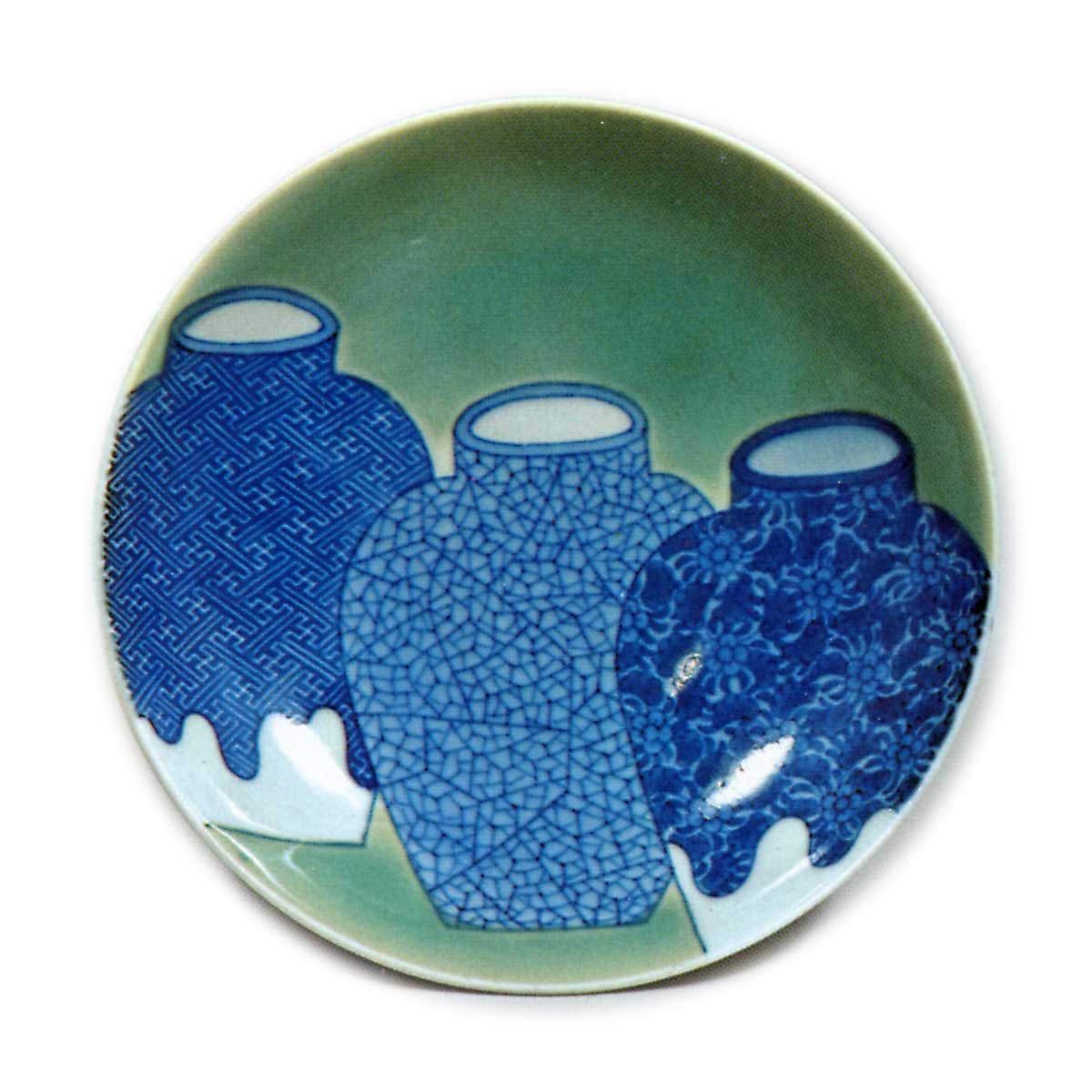 锅岛青瓷染付三壶纹盘 日本锅岛青瓷染付三壶纹盘 2025.10.06 锅岛青瓷染付三壶纹盘 高4.7厘米 口径14.6厘米 底径7.4厘米 冈山美术馆此盘以青瓷染付技法描绘三只壶,背面三处饰有七宝结纹,绳结末端呈长条状延伸。盘底饰有梳纹高台。