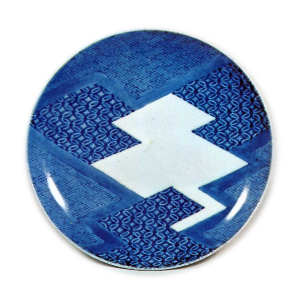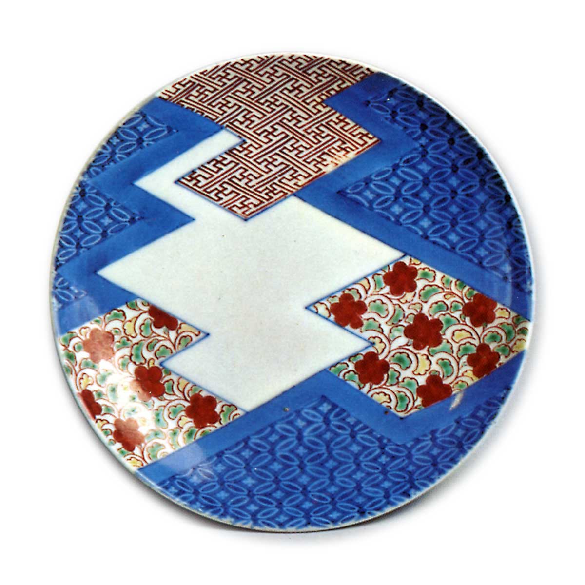 锅岛纱綾形纹盘 日本锅岛彩绘纱绫纹盘 2025.10.06 锅岛彩绘纱绫纹盘 锅岛蓝绘纱绫纹盘 两件作品均为纱綾形纹饰的盘器,但初图饰有彩色绘纹。器形采用古锅岛风格的浅立边造型,底面饰以三方牡丹花纹的通体唐草纹。高台饰有梳纹。