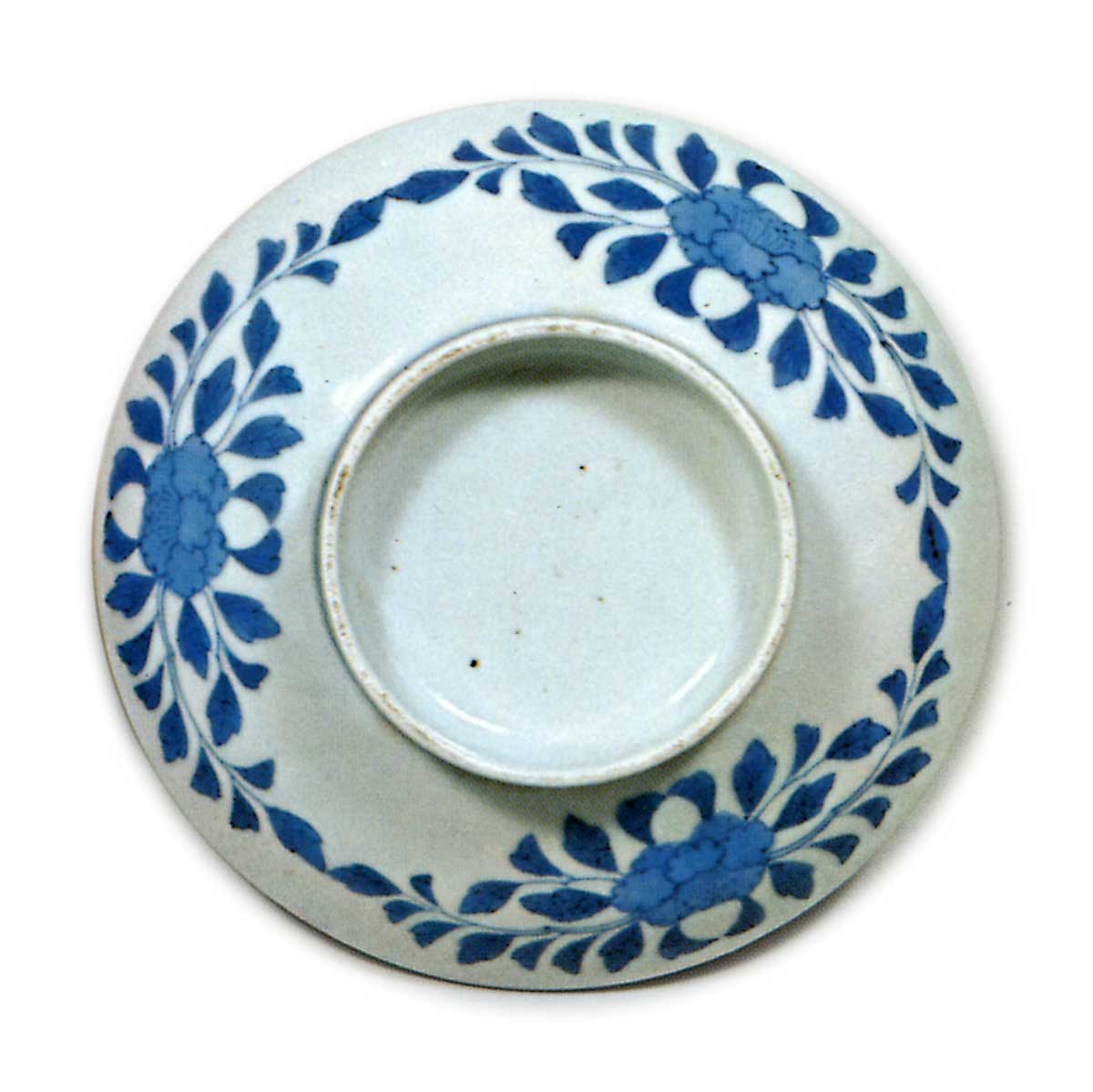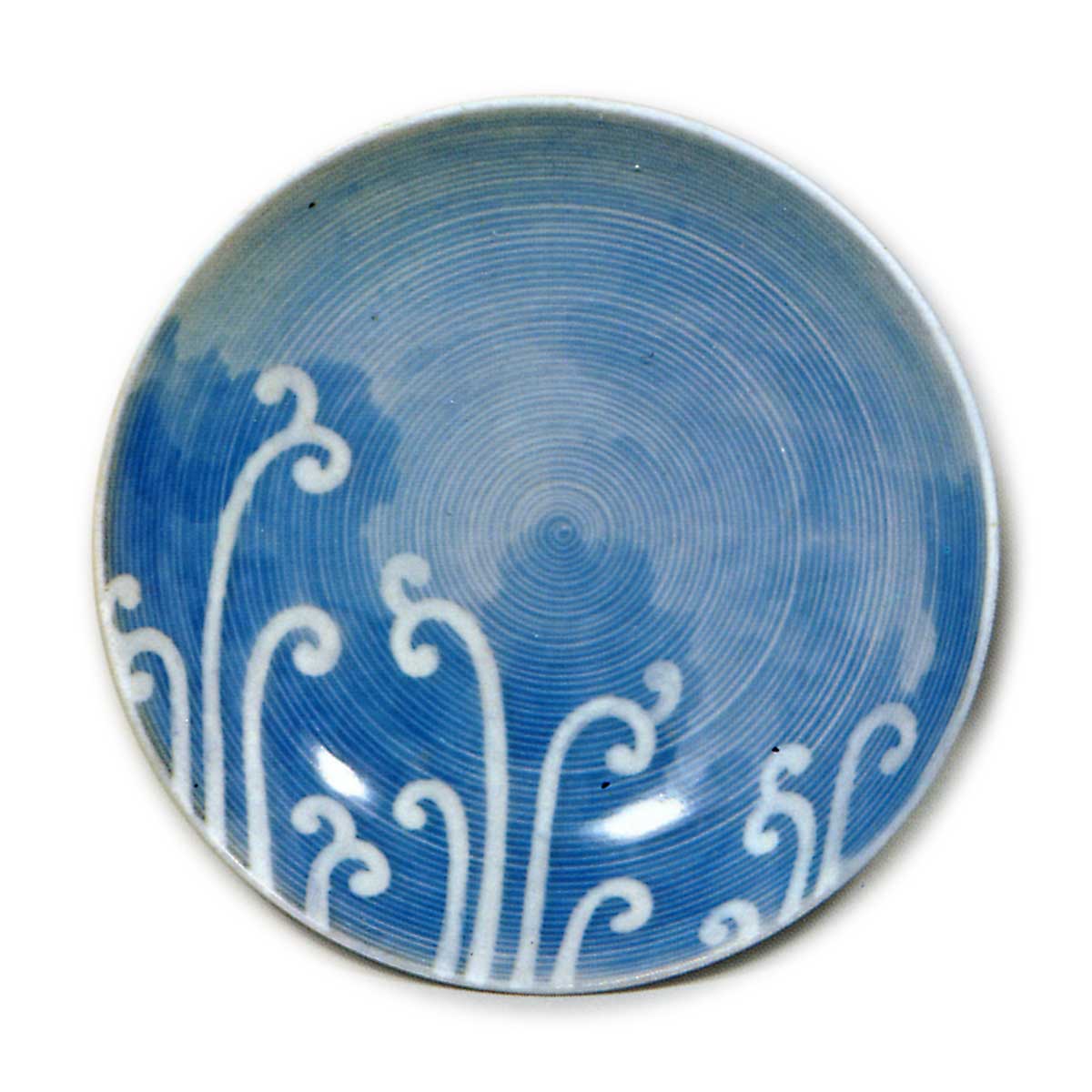 锅岛青花蕨纹盘 日本锅岛青花蕨纹盘 2025.10.06 锅岛青花蕨纹盘 锅岛青花蕨纹盘 高4.5厘米 口径14.7厘米 底径7.3厘米盘面以墨色晕染技法施以细密涡纹,其间点缀数株白底蕨叶,构成罕见纹样。底背牡丹唐草纹笔触略显生硬,底足环绕着莲瓣变形的连续纹饰。