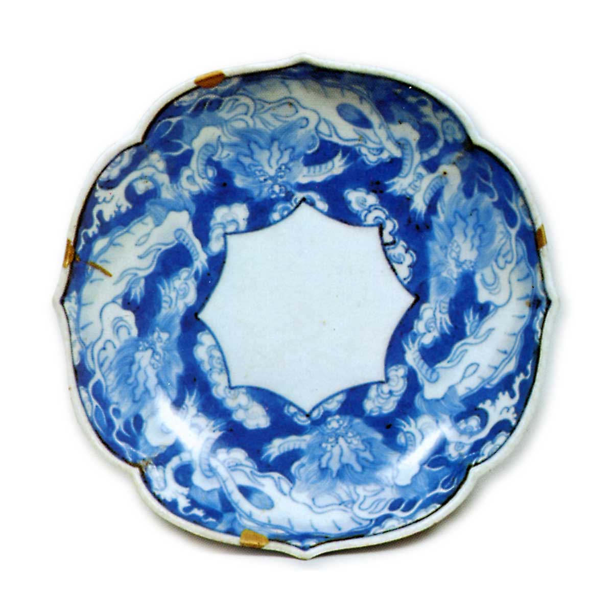 锅岛青花龙纹盘 日本锅岛青花龙纹盘 X Facebook Hatena Bookmark LINE Pinterest 复制 2025.10.06 锅岛青花龙纹盘 高3.4厘米 口径11.8厘米 底径6.5厘米此盘口沿饰四瓣轮花纹,盘面绘有四条盘旋于云间的龙纹。虽属青花瓷,但图案在锅岛瓷中较为罕见,制作工艺亦属上乘。