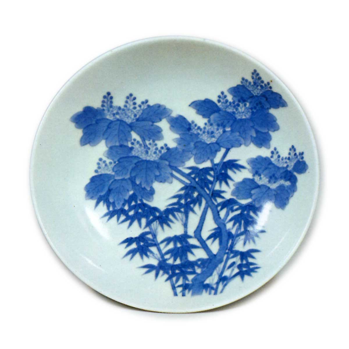 锅岛染付桐竹纹盘 日本锅岛染付桐竹纹盘 2025.10.06 锅岛染付桐竹纹盘 高4.5厘米 口径14.4厘米 底座直径12.3厘米此盘饰桐竹纹样,图案颇为罕见。作风略显纤弱,或为享保年间之后之作。底面饰七宝结纹,施梳纹高台。