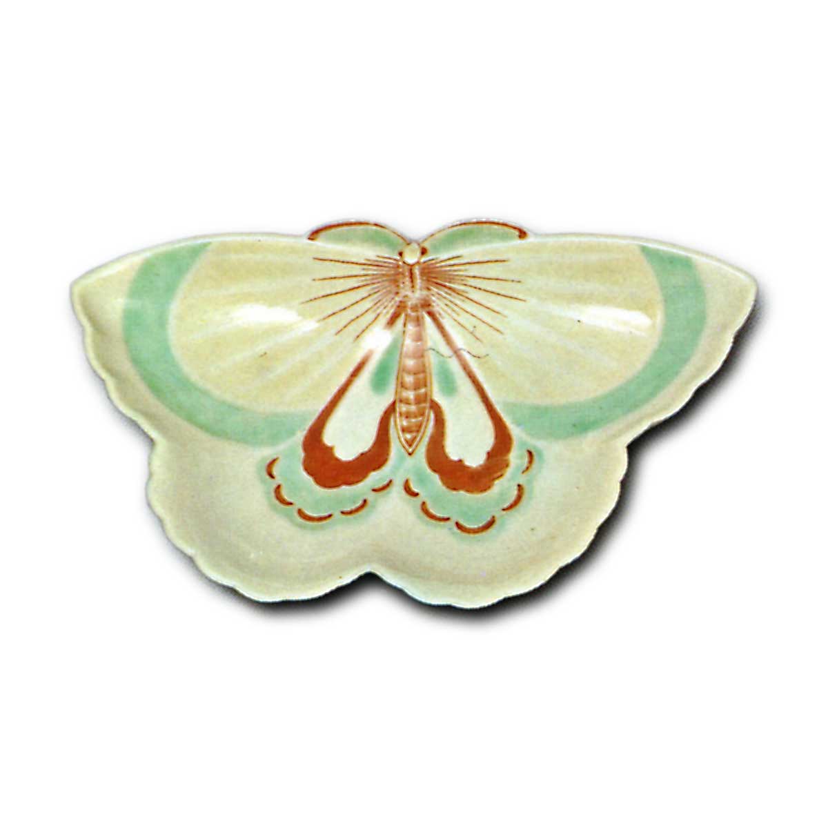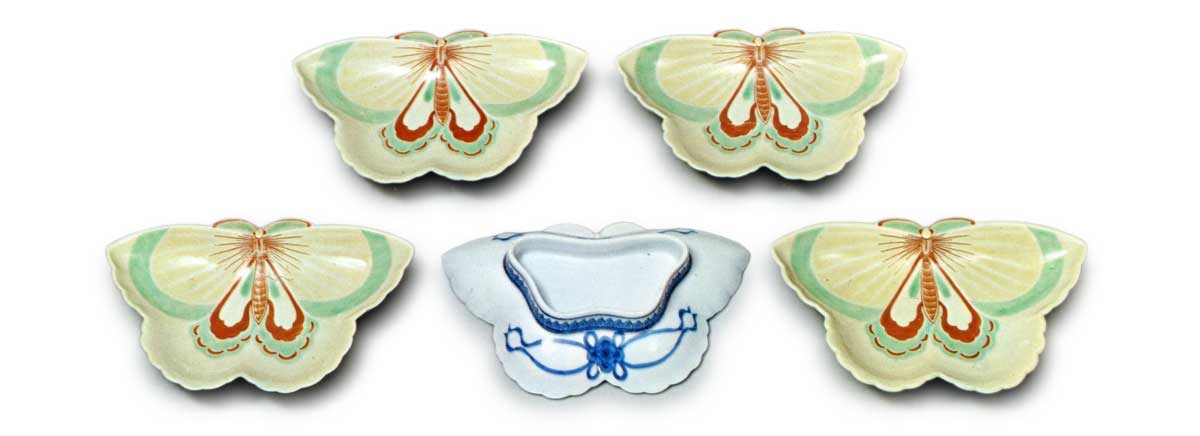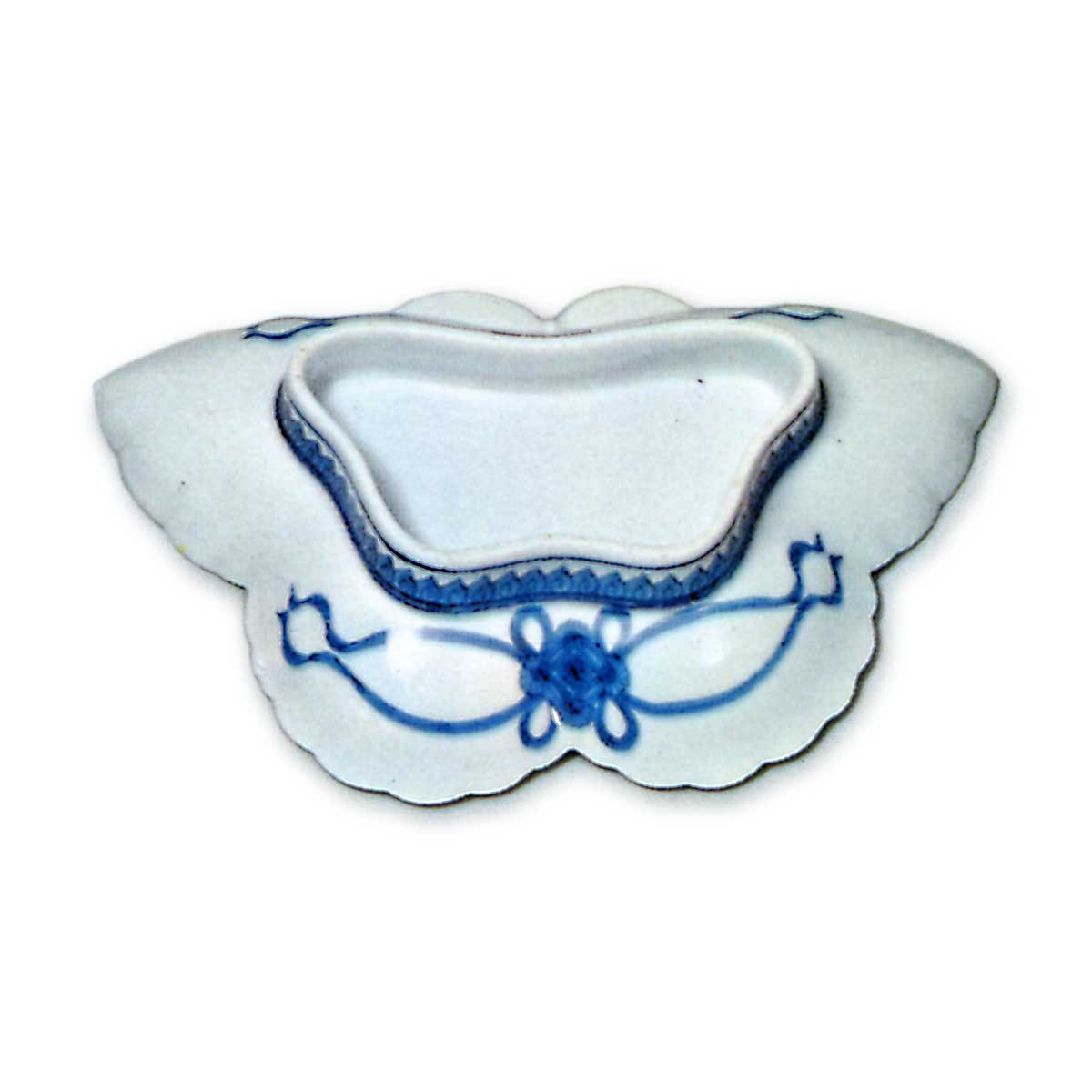 锅岛彩绘蝶形盘 日本锅岛彩绘蝶形盘 2025.10.06 锅岛彩绘蝶形盘 锅岛彩绘蝶形盘 锅岛彩绘蝶形盘 高3.2厘米 口径15.9×9.0厘米 底座直径9.1×4.4厘米 根津美术馆此为以蝴蝶造型模压成型的异形碟,实属罕见之作。碟面全面施以彩绘,呈现蝴蝶纹样,整体色调淡雅。碟底两侧饰有唐花风格的七宝结纹,高台边缘环绕锯齿状莲瓣纹。