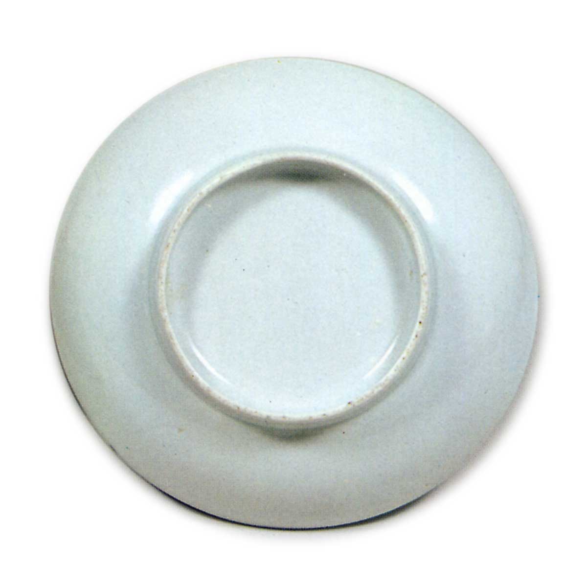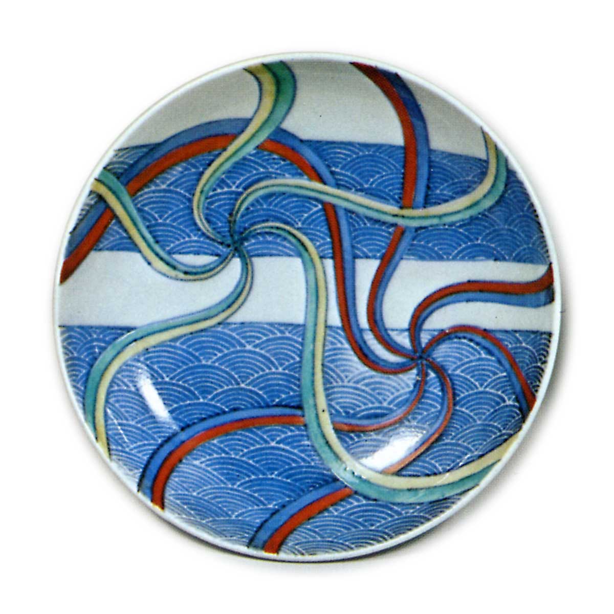 锅岛色绘布晒纹盘 日本锅岛色绘布晒纹盘 2025.10.06 锅岛色绘布晒纹盘 锅岛色绘布晒纹盘 高3.2厘米 口径11.3厘米 底径6.0厘米 冈山美术馆此为色绘三寸盘的杰作,以青海波为底纹,饰以扭花风格的绳纹图案,其间透出精炼的设计美感。盘底为素白无纹。