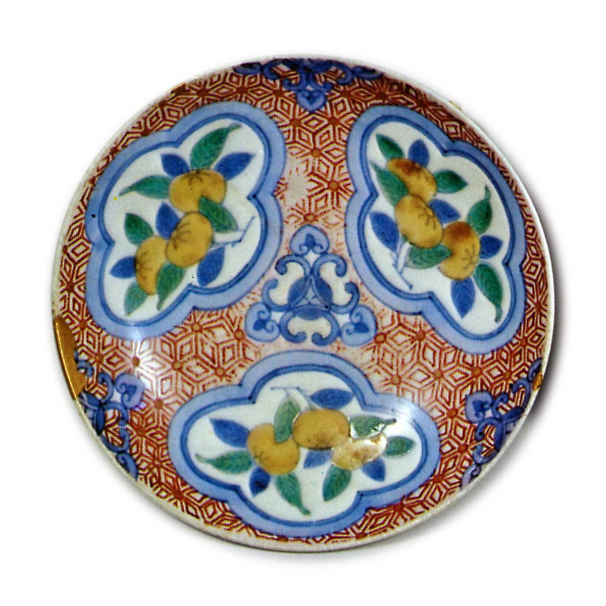 锅岛色绘橘纹盘 日本锅岛色绘橘纹盘 2025.10.06 锅岛色绘橘纹盘 锅岛色绘橘纹盘 高3.3厘米 口径11.5厘米 底径6.2厘米此盘以三面窗格内饰橘枝折枝纹,底面饰菱花纹,图案罕见。背面三面饰牡丹折枝纹,底足为梳纹高台。匣内题记称宽政年间由锅岛家奉赐为杯。