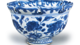 此小碗造型清雅,碗口边缘向外反卷,三面形成花瓣状。三面分隔的碗身以白色勾勒圆形纹样,内部绘有红绿相间的唐花纹。红色艳丽夺目,绿色则呈现锅岛特有的青绿色调,堪称色绘锅岛最美的色泽。内壁为素白无饰。