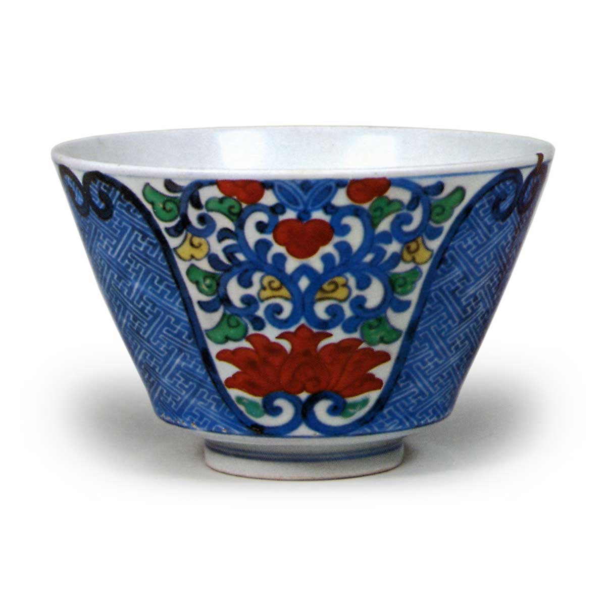 锅岛色绘唐草纹小碗 日本锅岛色绘唐草纹小碗 2025.10.06 锅岛色绘唐草纹小碗 高6.6厘米 口径10.0厘米 底径4.0厘米碗身三面饰以唐花风格的唐草纹,间隙处以墨色勾勒的白色纱绫纹填充。此作亦属锅岛小碗中工艺最为精湛之作。内壁为素白无纹。