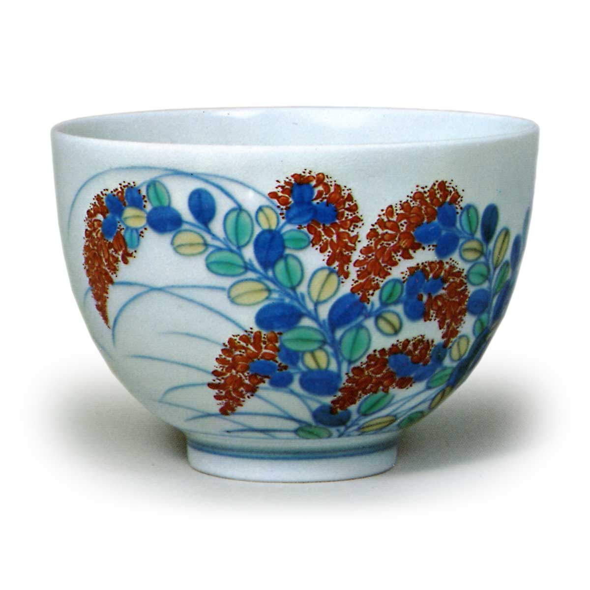 锅岛色绘萩纹小碗 日本锅岛色绘萩纹小碗 2025.10.06 锅岛色绘萩纹小碗 高6.9厘米 口径9.9厘米 高台径4.2厘米此小碗造型端庄,器身微微外张,盘面饰有娇艳绽放的萩花纹样。线描笔触优美。内壁为素白釉。