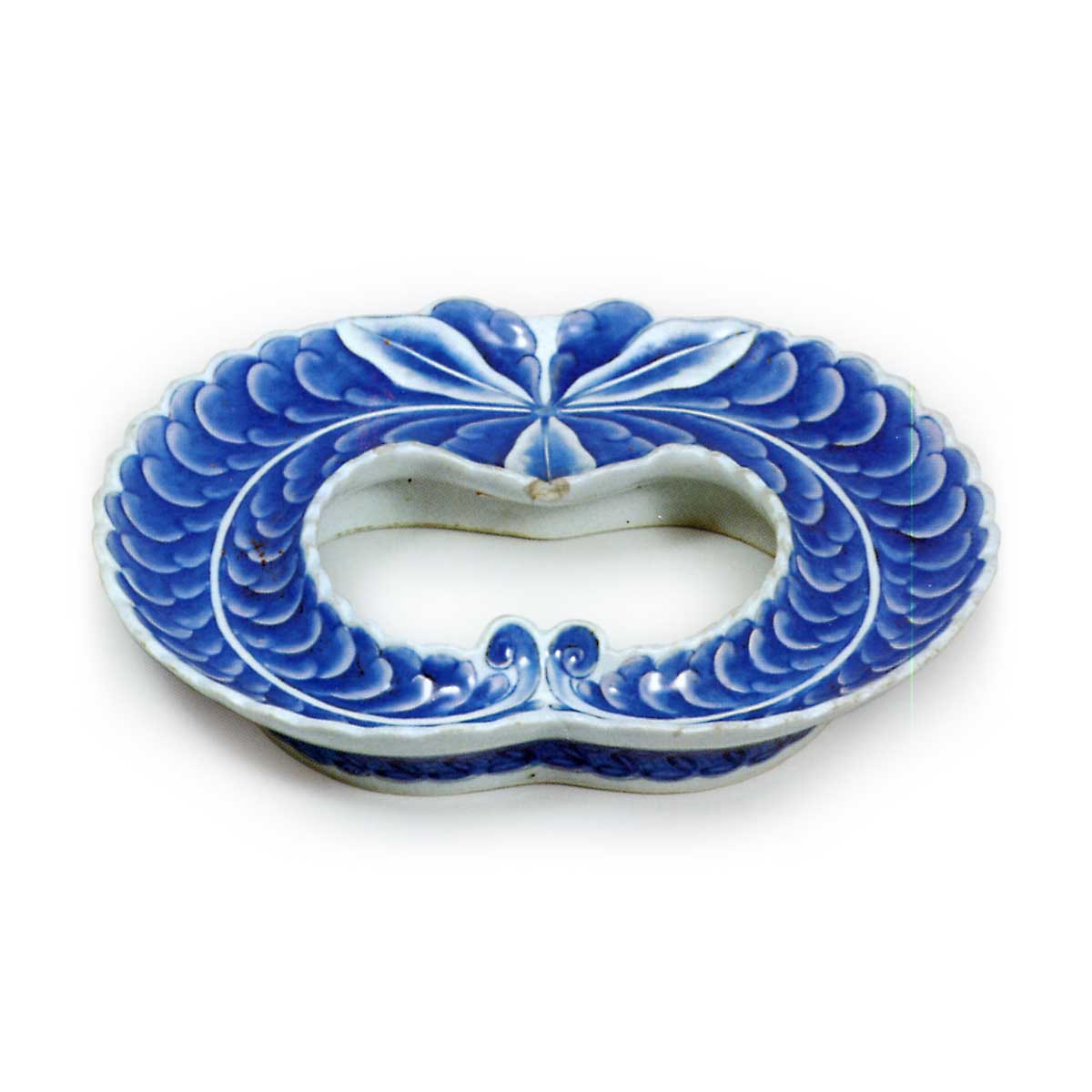 锅岛青花藤花纹盘 日本锅岛青花藤花纹盘 2025.10.06 锅岛青花藤花纹盘 高4.2厘米 口径21.9×18.0厘米 底座直径15.4×11.4厘米此盘以垂藤家纹为设计元素,造型独特,然其用途何在?稍高的底座上环绕着七宝衔接纹饰。