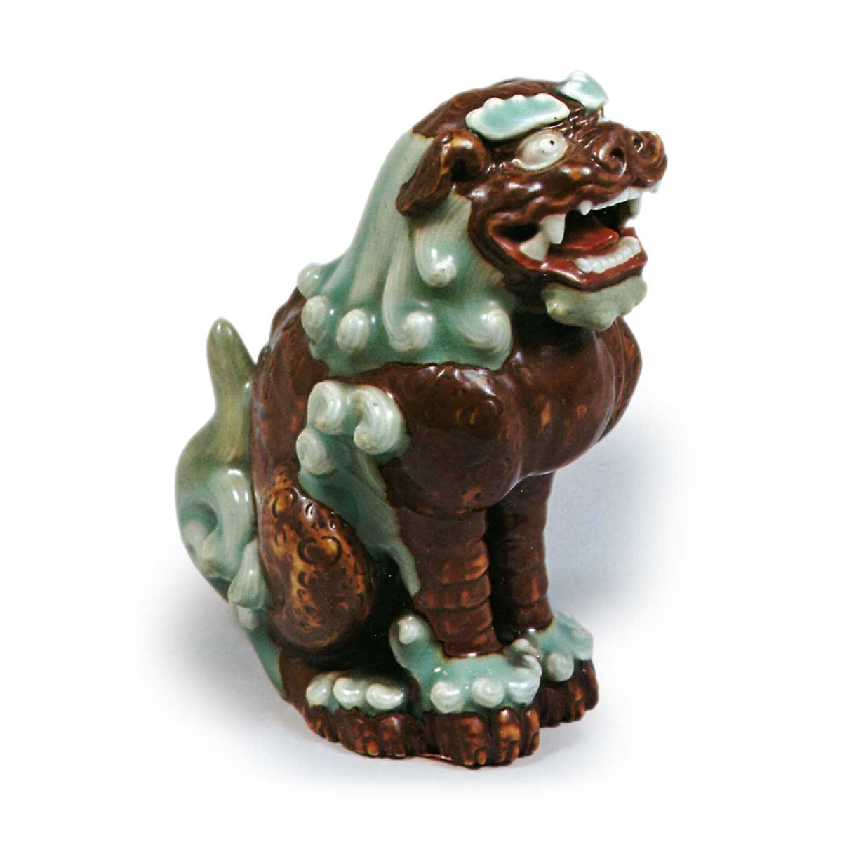 锅岛锈釉狮子 摆件锅岛锈釉狮子 2025.10.06 锅岛锈釉狮子 锅岛锈釉狮子 此为成对的阿形与吠形磁制狮子。磁制狮子在柿右卫门等作品中常见,但于锅岛烧实属罕见。狮身涂覆锈釉,眉毛与髻饰等部位,阿形以青瓷烧制,吠形则以深琉璃釉为底施染。虽体型小巧,却作工颇具力度,应属锅岛烧古作范畴。