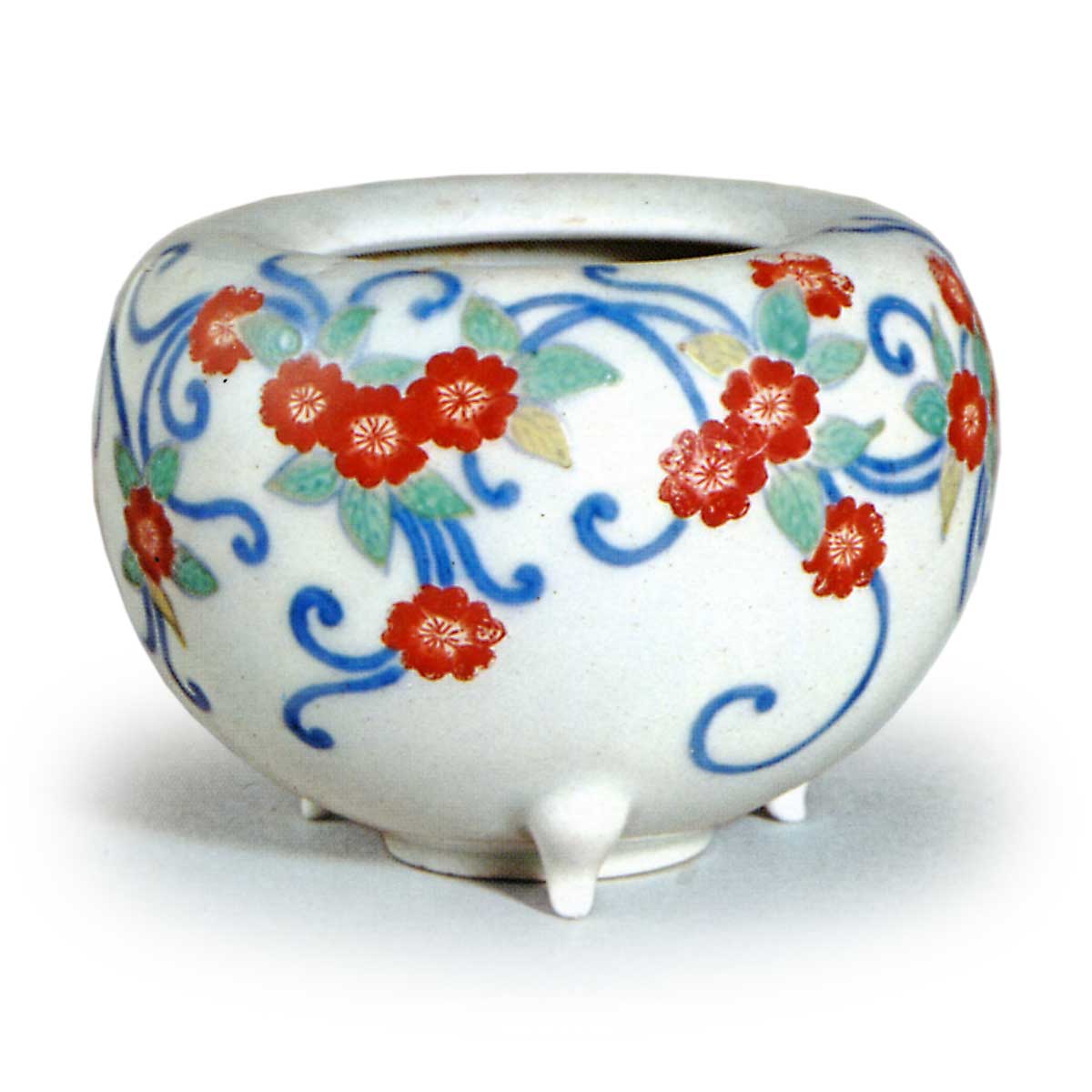 锅岛彩绘樱花纹香炉 日本锅岛彩绘樱花纹香炉 2025.10.06 锅岛彩绘樱花纹香炉 高5.0厘米 口径3.7厘米 胴径7.2厘米 底径2.5厘米此为口部呈姥口造型的圆形香炉,高台小巧紧凑,胴身底部三面附有支脚。此类器型实属罕见。以唐草纹样表现的樱花纹彩绘,其色泽呈现极为精美。