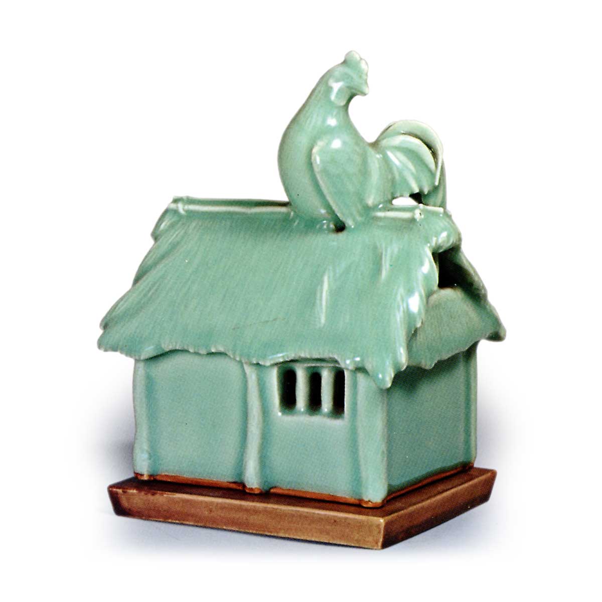 此青瓷香炉以葛屋屋顶栖息雄鸡为造型,台座施以薄层涩釉。青瓷釉色烧制得极为精美。