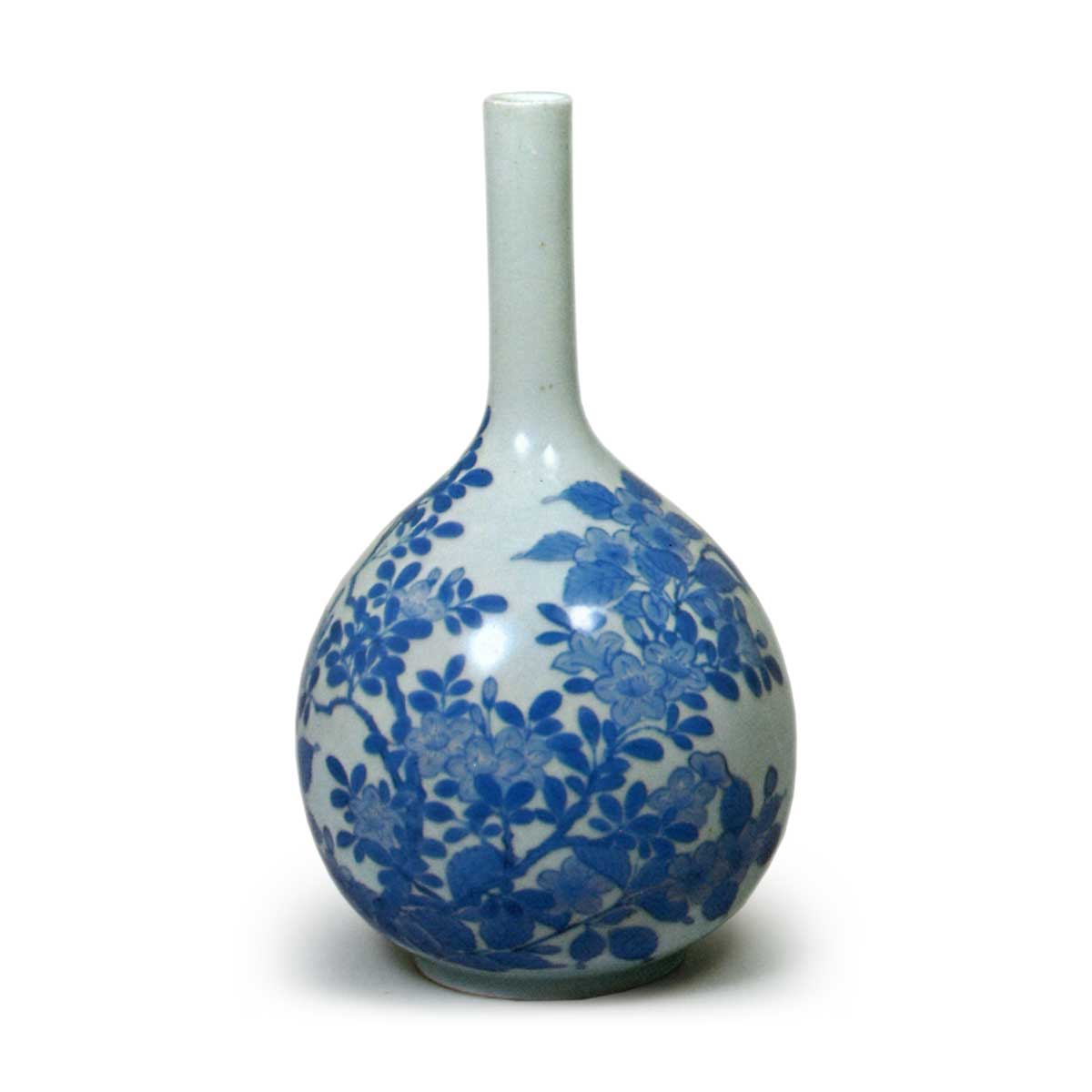 锅岛青花空木纹酒壶 日本锅岛青花空木纹酒壶 2025.10.06 锅岛青花空木纹酒壶 高19.9厘米 胴径11.1厘米 口径1.8厘米 底径6.1厘米此酒壶瓶颈部纤细,瓶身圆润饱满,造型温婉。空木纹样遍布瓶身,釉层稍厚,釉面略显润泽。应为享保年间(1716-1736)之后的制品。