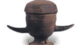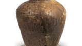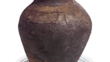 此作作为古九谷样式彩绘时期的代表作而闻名,与图2所示器物同属最大尺寸之列。此为腰部带阶的大平碗,口沿低平上翘。因器型硕大,碗壁深厚,底足相较口径则显小巧,呈低矮厚实之态。除贴足处外,白釉几乎均匀覆盖于器身全貌。内壁中央圆窗内绘有巨型船只,其后方铺陈渔网,前景则以左右对称的岩石与土坡构成大胆的意象设计。圆窗周边环绕锯齿状花瓣纹,开阔的边缘饰以波浪形唐草纹,以红线勾勒后点染赤彩,营造出白地浮雕般的视觉效果。釉面紫、绿、黄的暗色调与口沿处红底白描风格的唐草纹构图相得益彰,堪称绝妙搭配。口沿外侧更以浅蓝釉勾勒粗线,使边缘纹样更显灵动。器背三面饰以涡纹为中心的云纹,高台内侧均以红彩绘有“太明”字样,其字体与古伊万里青花瓷器常见的“太明”铭文极为相似。高台内侧存在釉面剥落现象,高台边缘残留指痕。