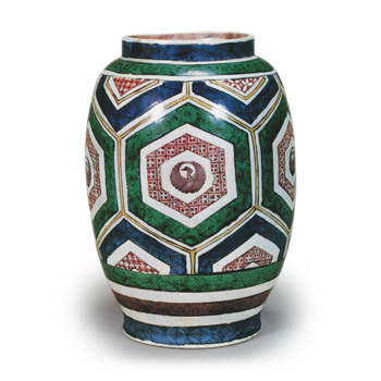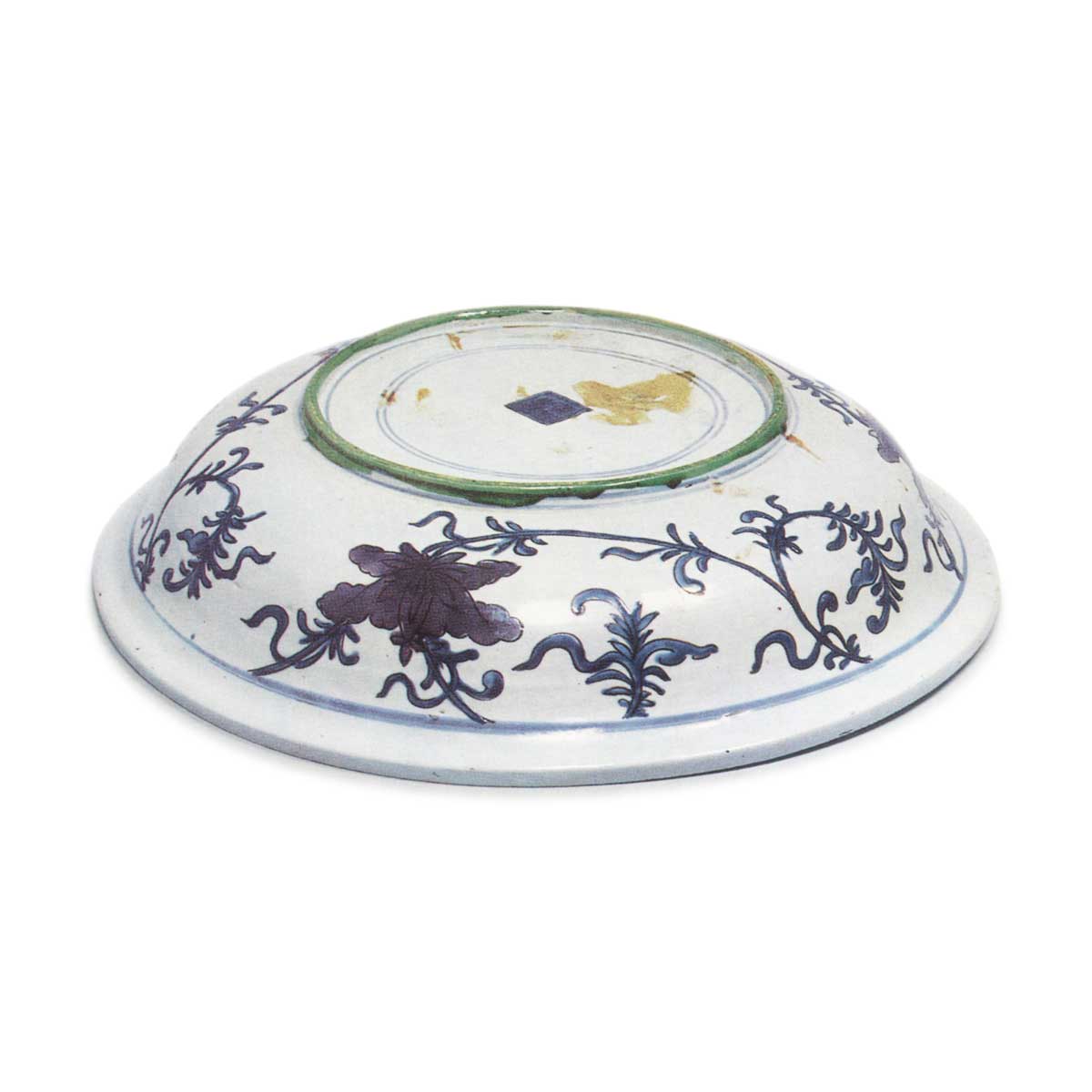 此作乃牡丹图大碗中最华美的典范,亦是象征古九谷彩绘风格的极具声望之作。碗内描绘着盛放的大花与花苞,叶影间停驻一只蝴蝶,另一只则翩然飞舞于花丛间。相较图5作品更具动态感,器缘饰以十二枚龟甲纹,内侧配以纱绢纹与对飞蝶纹,装饰性更胜一筹。器形为腰部圆润、口沿外翻、器缘低立的稍深平碗,高台亦成形较大。器内壁、外口沿、高台边缘及高台内侧均饰以青花线条,外侧绘有三方牡丹唐草纹,以紫色与绀青色上彩。高台内侧双角框内题写“福”字铭文,上方覆施绀青釉。
