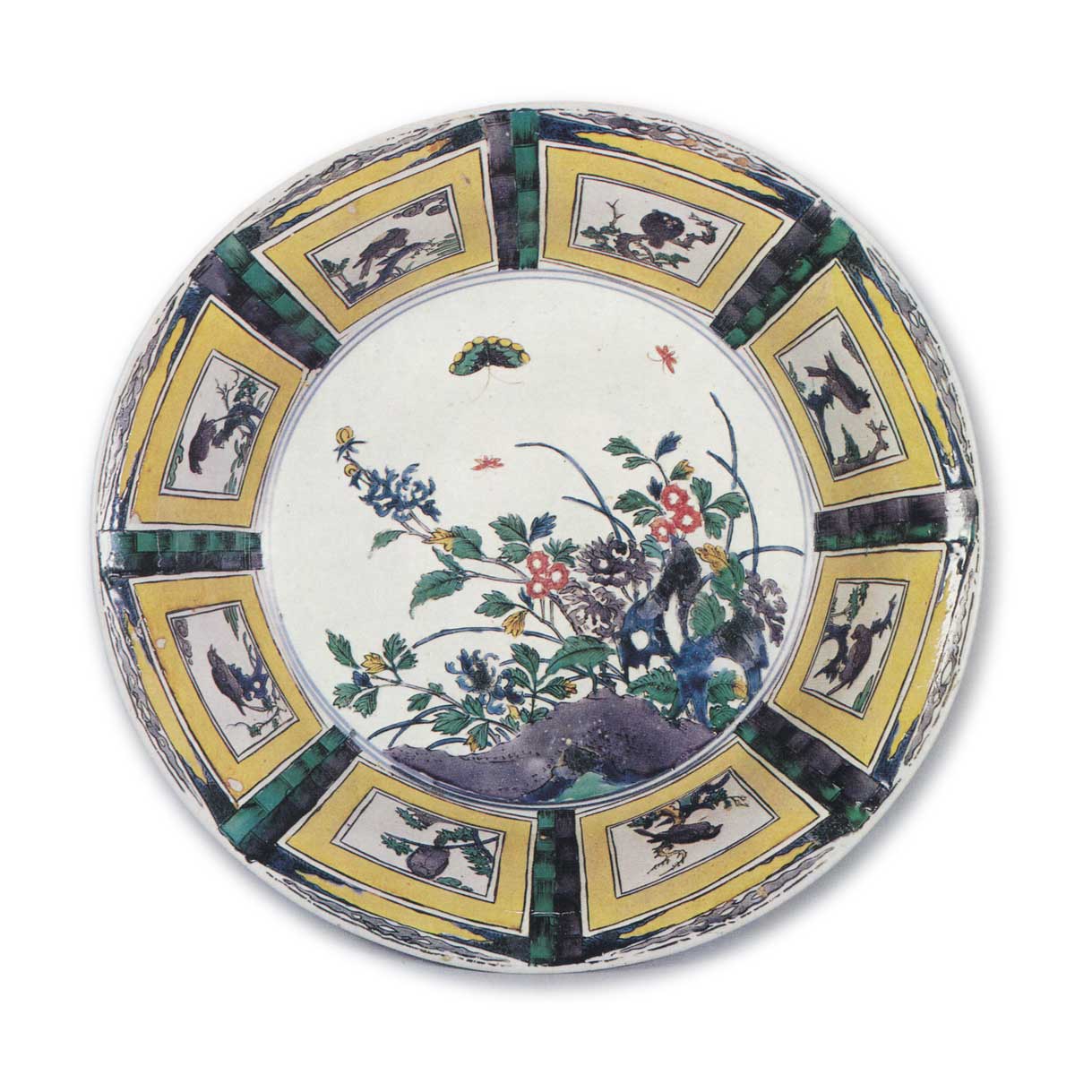 古九谷色绘草花纹大碗 古九谷古九谷色绘草花纹大碗 2025.10.09 古九谷色绘草花纹大碗 高11.0厘米 口径41.2厘米 底径21.3厘米远山纪念馆与色绘龟甲牡丹蝶纹大碗器形相同,图案虽异但应属同期作品。内圈圆窗内绘有土坡与太湖石,其间栽植着开花含苞的牡丹树,点缀草花,并于空间中散落三只大小不一的蝴蝶,此类大盘器皿中实属细腻纹样。盘缘饰以八分格的黄边彩纸纹样,每格绘有栖息老树的鹰,另有两处描绘猫头鹰。背面设五处格栅式窗格,每格绘制山水图,窗格间以唐花纹装饰。高台内以篆书体文字书写于双圈内,其上施以绿釉。
