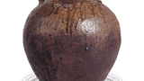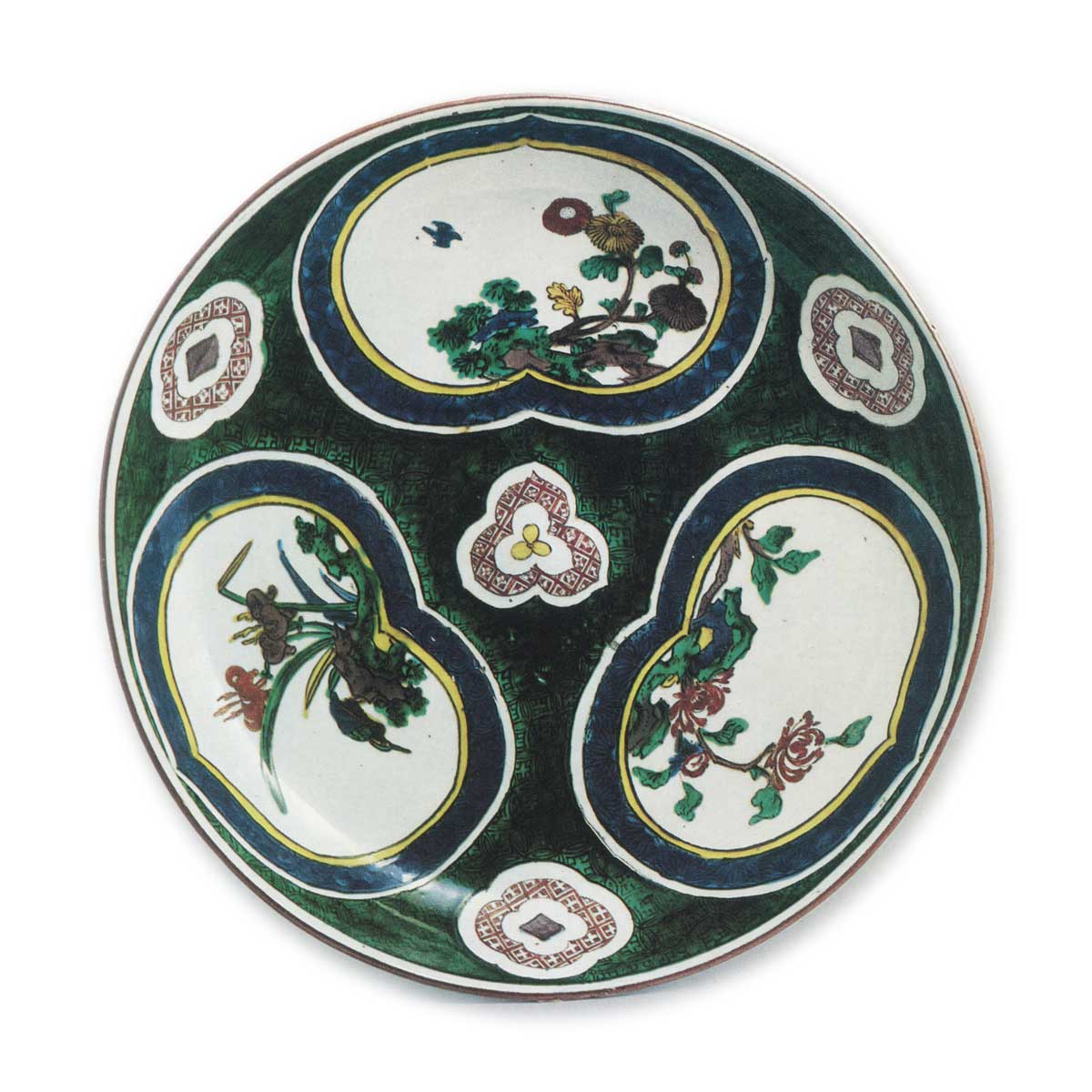 古九谷色绘牡丹菖蒲菊纹大盘 古九谷古九谷色绘牡丹菖蒲菊纹大盘 2025.10.09 古九谷色绘牡丹菖蒲菊纹大盘 高7.0厘米 口径34.2厘米 底径19.4厘米 萬野美术馆此为侧面呈圆弧弯曲的圆形大盘,平直口沿饰以红釉。在古九谷风格的彩绘器物中,采用红边设计的器物年代稍晚,此类器物多在外缘饰以青花唐草纹。盘面三面配置以靛蓝与黄色勾勒的州滨形大窗,窗内绘有菊与飞鸟、牡丹、菖蒲图案,中央饰三瓣花纹,窗与窗之间则呈现木瓜纹。以浓绿为基调的赋彩空间以七宝纹为底纹。各上彩颜料色调浓郁鲜艳。然而窗内花卉图案较之前期作品略显程式化。器底饰以青花牡丹唐草纹,高台内亦以青花绘制单角“福”字铭文。