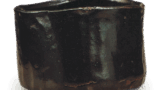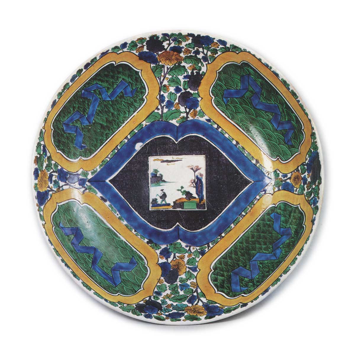 古九谷色绘色纸山水百花纹大盘 古九谷古九谷色绘色纸山水百花纹大盘 2025.10.09 古九谷色绘色纸山水百花纹大盘 高8.9厘米 口径37.4~38.8厘米 底径18.9厘米此为边缘呈圆弧弯曲的大盘,在古九谷风格大盘中尤以图案构思奇特见长。盘面中央设小色纸形镂空窗,内饰山水农夫图,四周以绀青上彩异形框饰环绕,四隅配以黄框格栅纹样。框内饰以青海波纹与锯齿状小纹,其间点缀似布晒纹样,底面则遍布古九谷风格特有的百花纹。背面饰以六方牡丹唐草纹,花朵施紫彩,藤蔓施绀青彩,叶片施绿彩,花苞施黄彩。高台内刻篆书“福”字铭文,上方覆施绿彩。