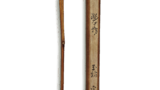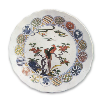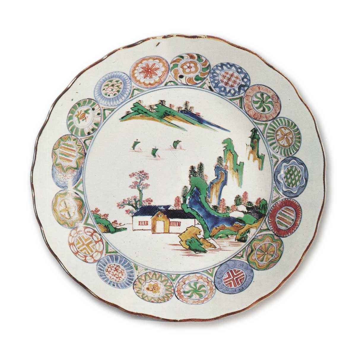 古九谷风格中存在着显著受祥瑞染付影响的典范作品,其制作可追溯至明朝末年崇祯年间,据信是应日本订单烧制的。此深碗以象征祥瑞的典型纹样——圆纹为装饰,堪称古九谷风格中堪称祥瑞手工艺的代表作。碗口边缘以轮花造型削制,形成红唇状。器身中央绘有近景屋舍与山水图,远景处点缀三艘帆船。其内侧以青花绘制十八枚圆纹,再施以彩绘点缀构成纹样。此种青花与彩绘并用的纹样表现手法,在古九谷样式中仅见于祥瑞手作品。器身图案虽与其他古九谷样式同样采用浓烈色调的颜料绘制,但圆纹的青花色调较为淡雅,彩绘亦未采用过于鲜艳的色系。圆纹内部呈现多样纹样,但这些圆纹并非预先规划布局绘制,而是逐一衔接排列,最终形成与其他圆纹重叠的状态,此处恰显出不拘形式的趣味。底纹采用三方构图,以青花绘制折枝枪梅纹,花朵点缀赤色,叶片饰以绿色上彩。高台内侧的双重圆圈中题写“福”字铭文,其字形笔画较少,相较于其他古九谷样式作品更显特色。高台内侧留有釉料未覆盖的区域,露出素坯质地。