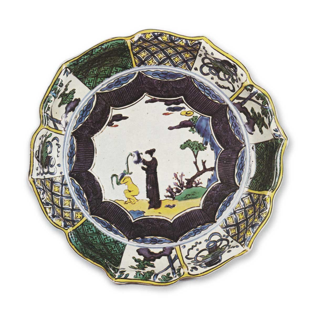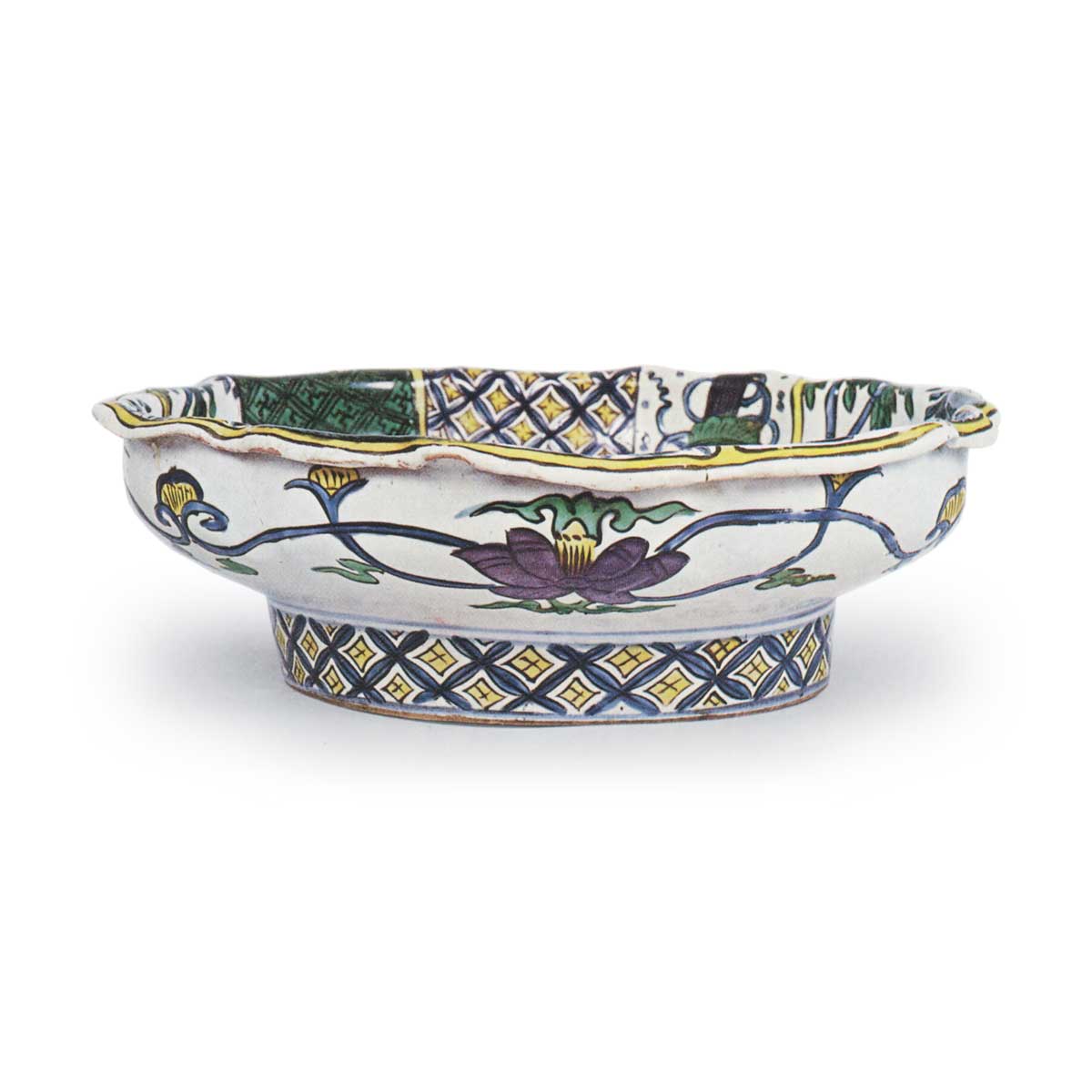 此为古九谷风格台盆的代表杰作,其高台并不算高,反而更接近于带稍高台脚的平盆器型。碗口呈端反弧形,形成六棱花状轮花台盆。碗内壁以十二棱粗框为界,描绘着裸体女子沐浴水注倾泻之水,以及持水注奉水的妇人。此图样实属罕见,虽可能源于典故,但具体出处尚不明确。器缘纹饰划分为十二区块,每区内分别配置宝尽纹、七宝纹、四方襷纹、竹纹等三种纹样。外缘饰以牡丹唐草纹,采用紫、黄、绿三色彩绘,高踞的高足内侧环绕着七宝地纹。