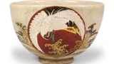 整体采用浓烈色调施彩,无论是纹样设计还是上釉工艺,皆属古九谷风格中尤为杰出的作品,胎体略显厚实。高台内侧双重角框内刻有篆书体铭文,然字迹潦草难以辨识。