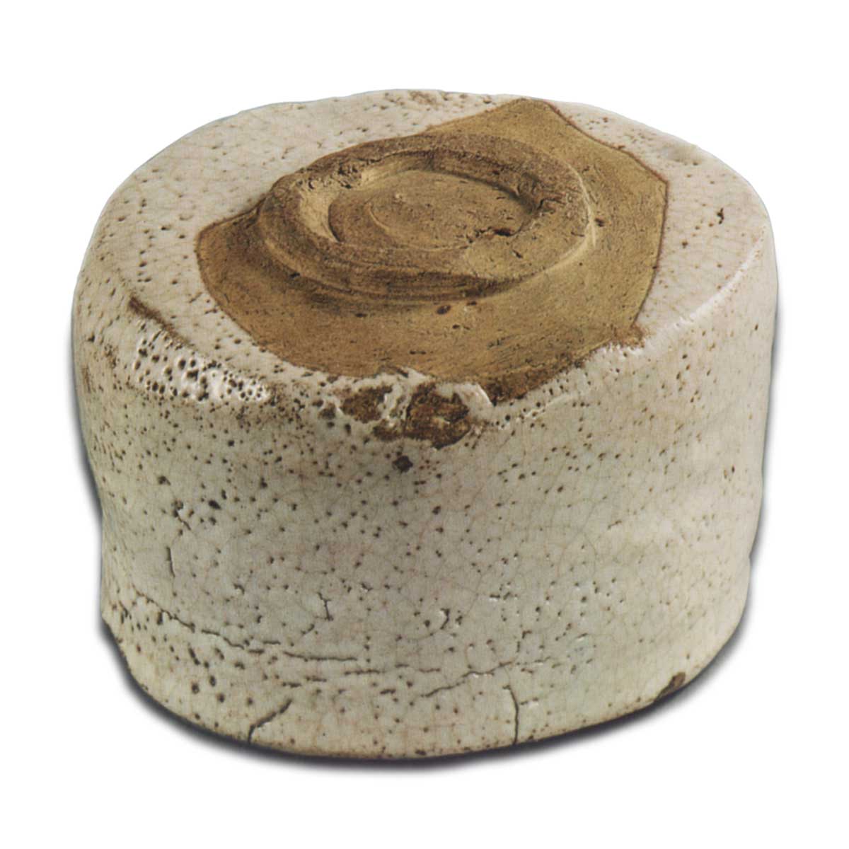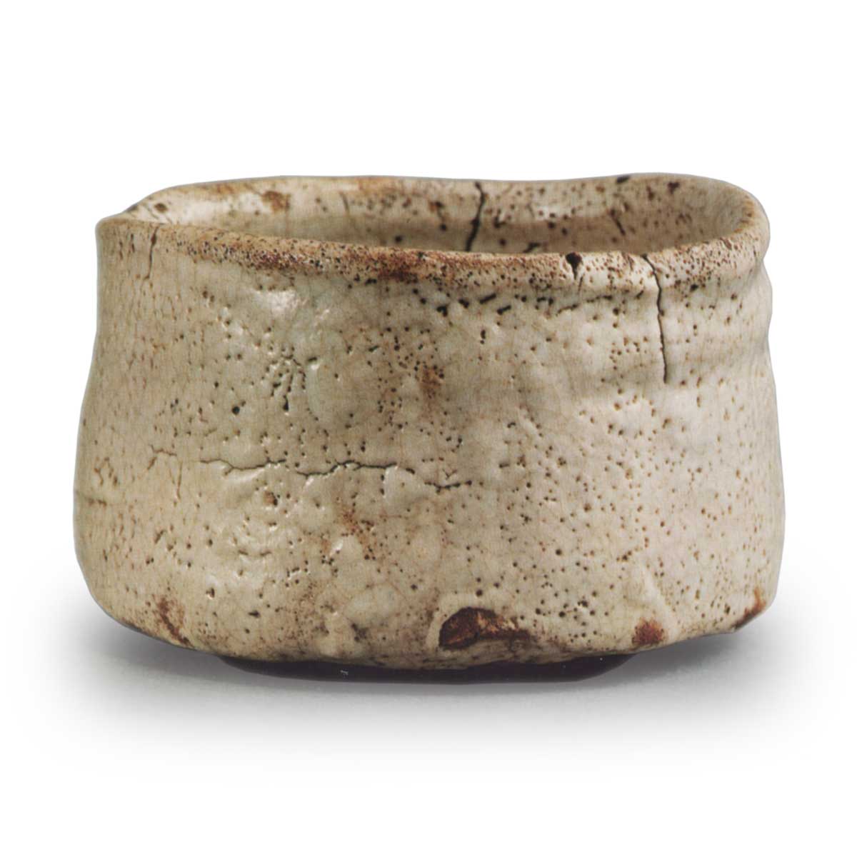 在施釉的地方有四个手指印,但不如Uka-bai上的清晰。在边缘与底部相接的地方,可以看到一丝火焰的颜色,但这只是施釉程度较低的Shino作品,而且由于过度烧制,火焰的颜色似乎已经褪去。然而,低度施釉并没有影响这个茶碗的优雅。