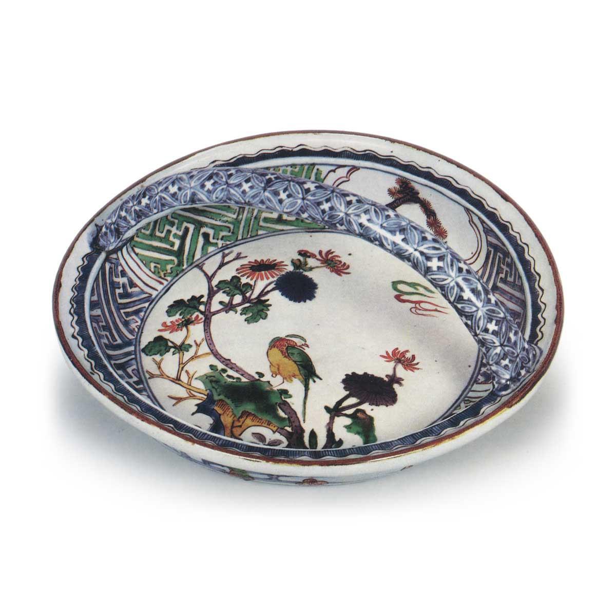 碗身采用镰刀形边缘设计,碗体稍深,配以弓形手柄。古九谷风格的手碗数量虽不多,但已见五六件作风各异的器物。与图29的酒壶相同,仅在把手处以青花绘制七宝纹样,此举应是为与器身彩绘图案协调所作的刻意设计。把手采用青花装饰后,器身描绘的花鸟纹样确实更显夺目。内壁圆窗以太湖石为中心描绘菊花,岩石上栖息着一只鹀鸟,配色极为优雅。器缘两侧开窗,内绘松树图,其余部分以红色勾勒沙绫纹样,并用绿色与靛蓝色描绘。镰刀状器缘低矮隆起,饰以红釉,整体作风呈现祥瑞之气。外圈四面饰以折枝枪梅纹,花朵点缀赤色,枝叶勾勒青绿。此类兼用染付技法的折枝纹样,与古九谷样式其他作品所见如出一辙。平底处留有削痕,附着砂粒纹理。其雅致韵味与华美作风相得益彰,令人尽享古九谷样式彩绘瓷器成熟期的精髓。