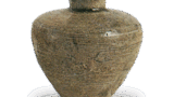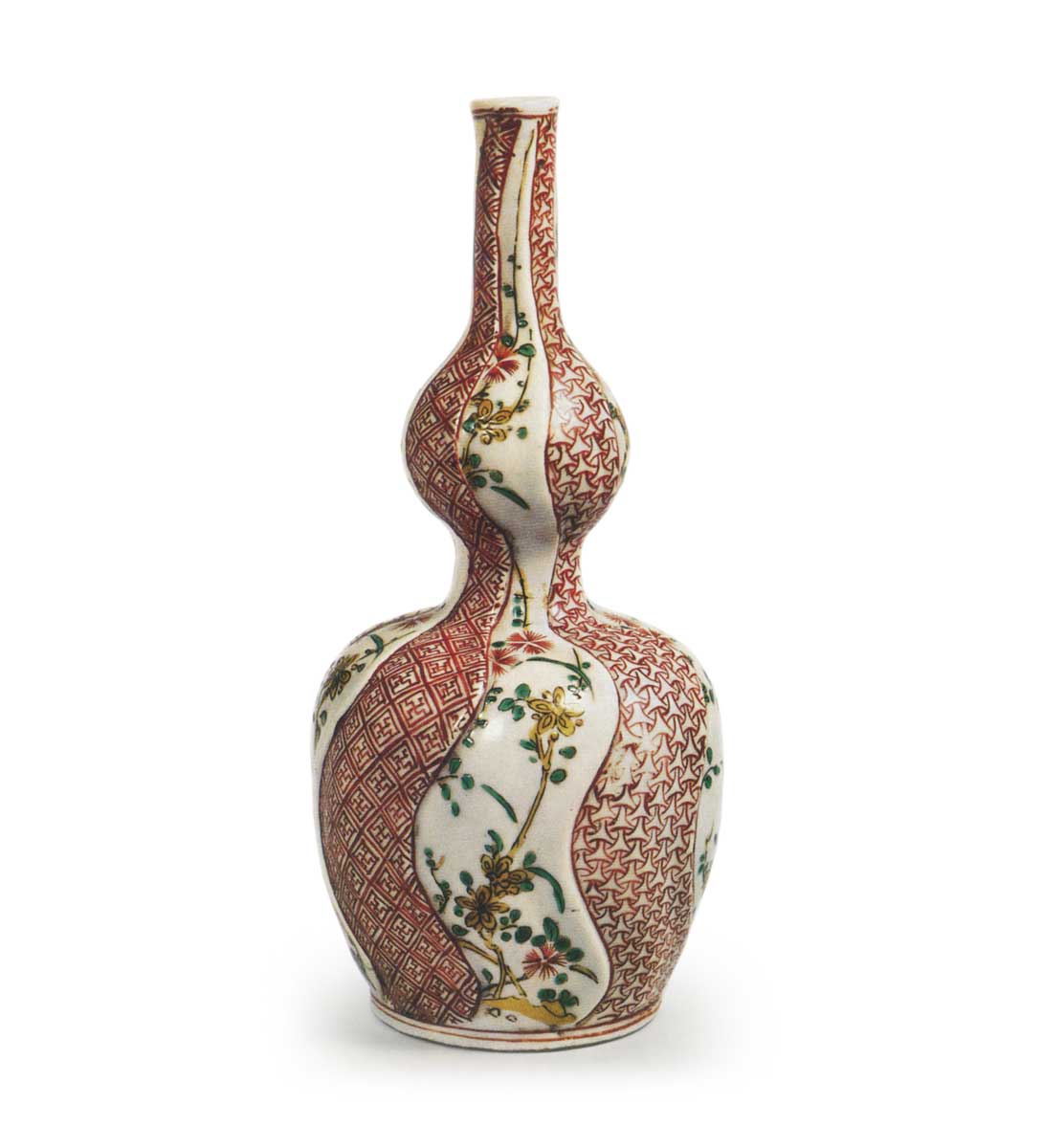古九谷色绘草花纹葫芦形酒壶 古九谷古九谷色绘草花纹葫芦形酒壶 2025.10.10 古九谷色绘草花纹葫芦形酒壶 高19.8厘米 口径1.9厘米 底径6.3厘米 东京国立博物馆此为东京国立博物馆所藏一对珍品,被誉为古九谷风格葫芦形酒壶中的翘楚。此器明显仿照祥瑞捻花纹酒壶,紧致的葫芦形壶身饰以捻花风格浮雕纹样,四面白地绘有草花纹,另四面则从壶口至壶底饰以赤色笼目纹与四方襷纹。底座为平底设计,但此类酒壶中亦存在采用蛇目高台的款式。