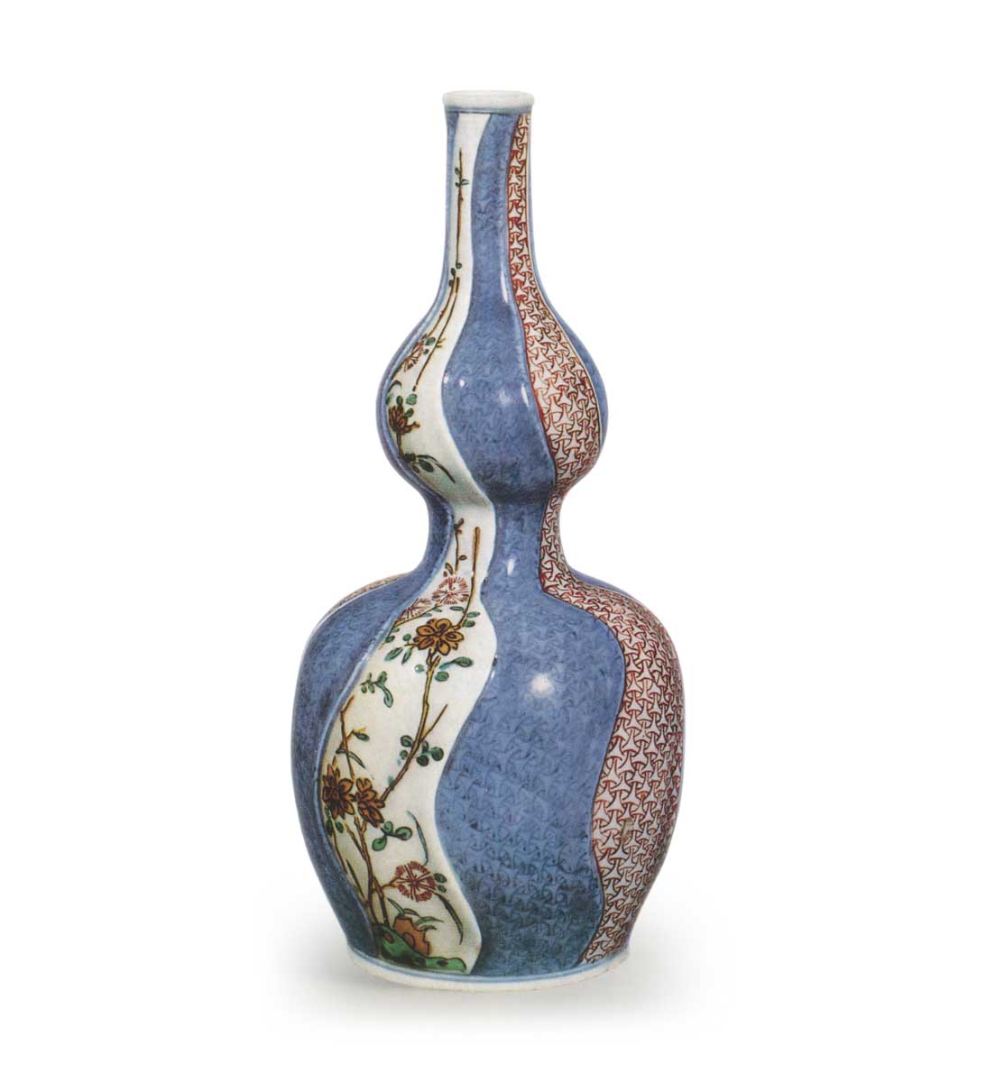 古九谷色绘染付草花纹瓢形酒壶 古九谷古九谷色绘染付草花纹瓢形酒壶 2025.10.10 古九谷色绘染付草花纹瓢形酒壶 高19.8厘米 口径2.0厘米 胴径9.1厘米 底径6.4厘米器形与意匠几乎与色绘草花纹瓢形酒壶无异,但此器除色绘外更添青花装饰,营造出更为翩跹的装饰效果。高台未经削制而作平底,且未施釉。