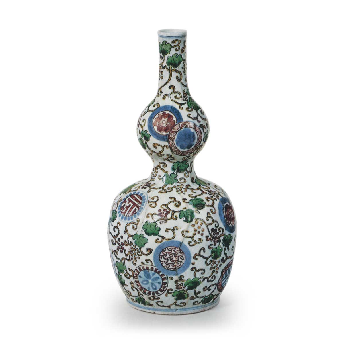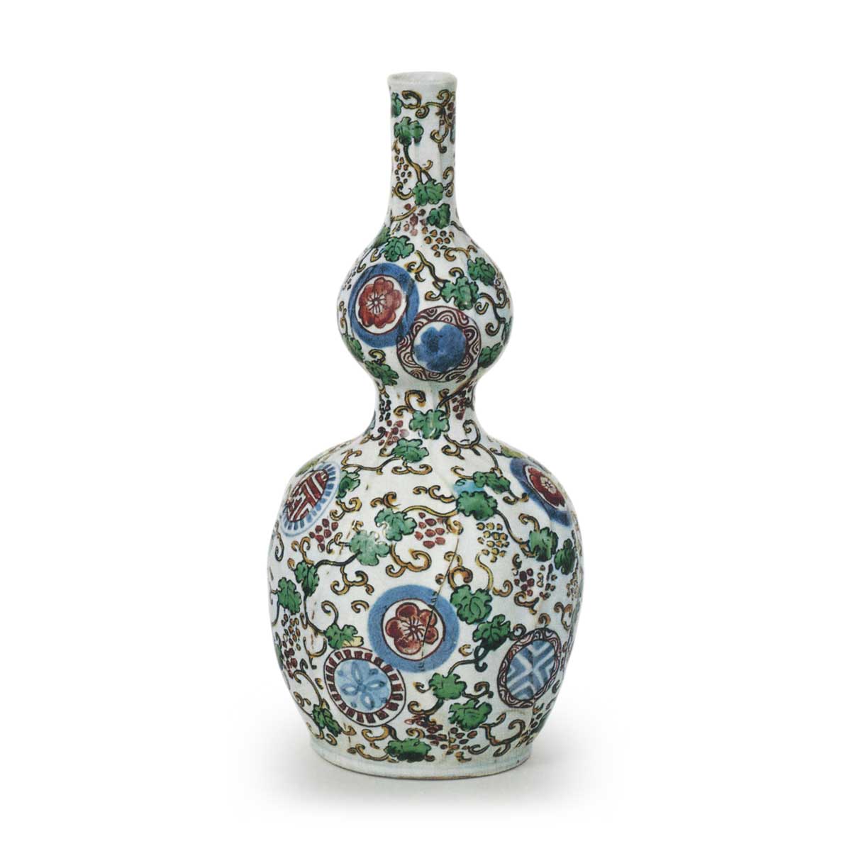 古九谷色绘葡萄唐草丸纹瓢形酒壶 古九谷古九谷色绘葡萄唐草丸纹瓢形酒壶 2025.10.102025.10.11 古九谷色绘葡萄唐草丸纹瓢形酒壶 古九谷色绘葡萄唐草丸纹瓢形酒壶 高18.4厘米 口径1.9厘米 底径6.4厘米此瓢形酒壶饰有扭纹浮雕,壶身上下散落八枚祥瑞风格的圆纹,底纹处细密绘制葡萄藤蔓纹样。圆纹内部以青花与红彩描绘山水纹、梅花纹、樱花纹、四瓣花纹、纱绫纹及葵纹等图案,底足露胎呈平底状。